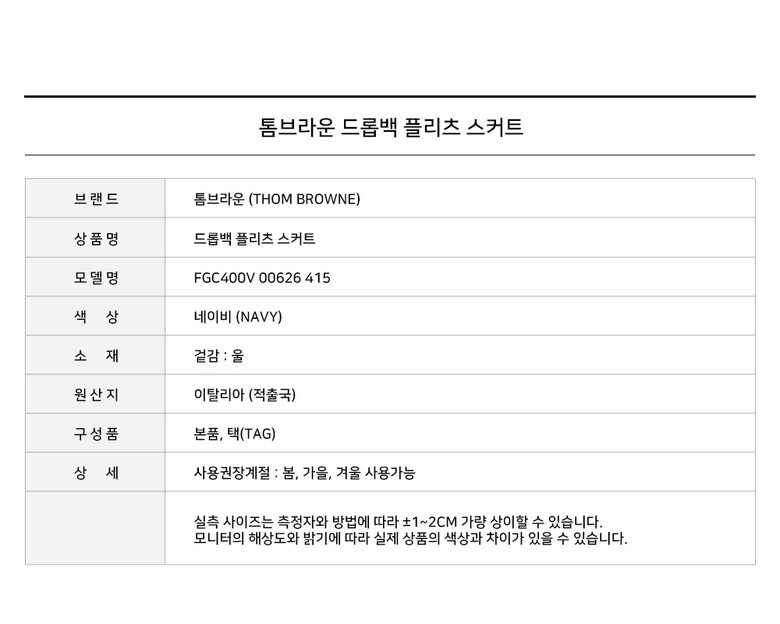 #리본즈코리아 #FGC400V00626415 #[명품] #25SS #톰브라운 #RWB #탭 #드롭백 #수퍼 #120수 #울 #플리츠 #스커트 #FGC400V #00626 #415 #여성 #의류 #하의