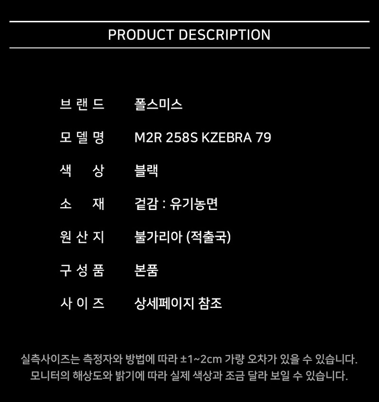 | 1. 제품 소재 (섬유의 조성 또는 혼용률을 백분율로 표시, 기능성인 경우 성적서 또는 허가서) | 상세페이지 참조 |