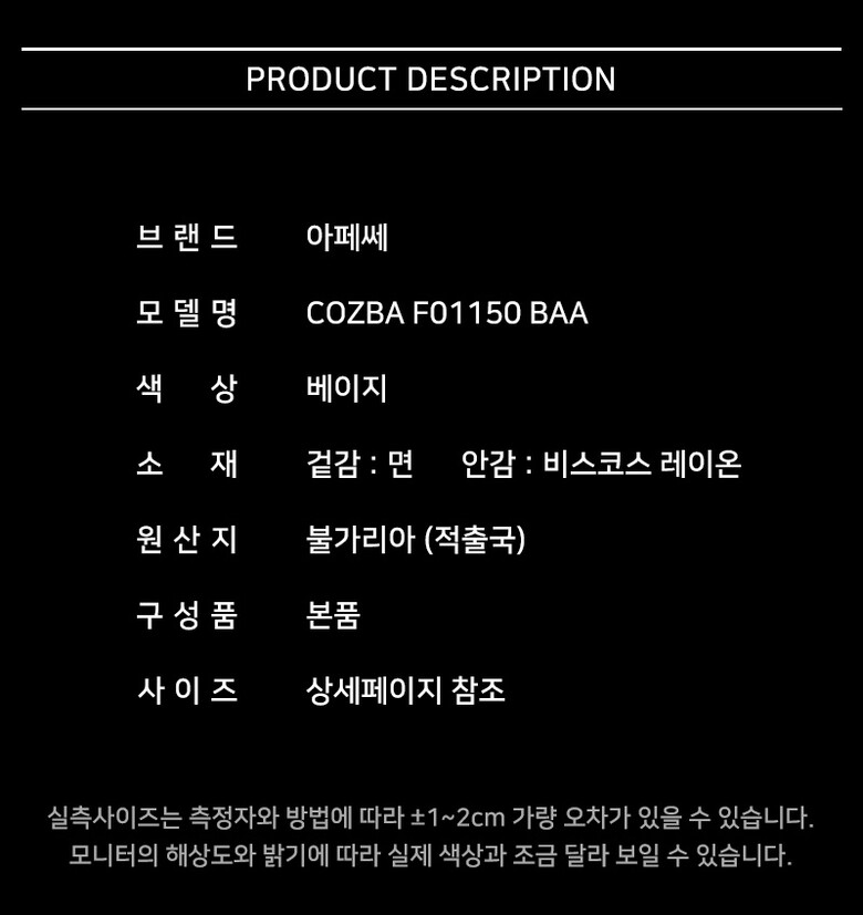 | 1. 제품 소재 (섬유의 조성 또는 혼용률을 백분율로 표시, 기능성인 경우 성적서 또는 허가서) | 상세페이지 참조 |