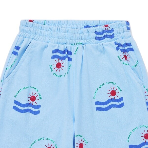 웨이브 나염 전판 저지 팬츠 입니다. 20수 싱글 소재로 가벼운 느낌에 부드러운 터치감이 특징이며 아이들이 입고 활동하기 편안합니다.