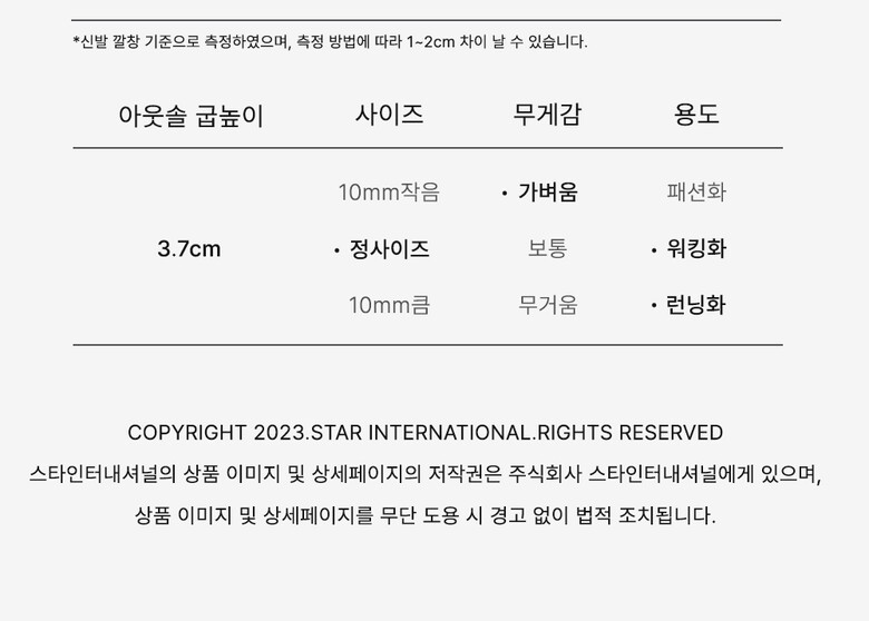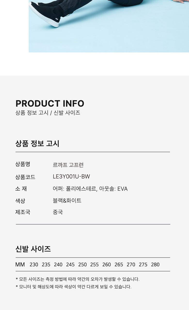 | 1. 제품 소재 (운동화인 경우에는 겉감, 안감을 구분하여 표시) | 상세페이지참조 |