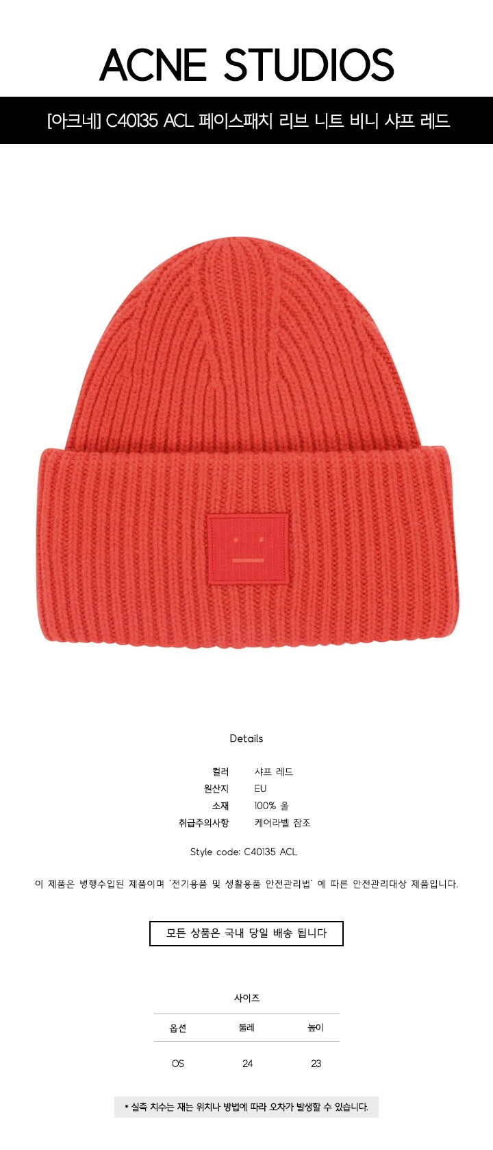 [명품] C40135 ACL 페이스패치 리브 니트 비니 샤프 레드 모자 /