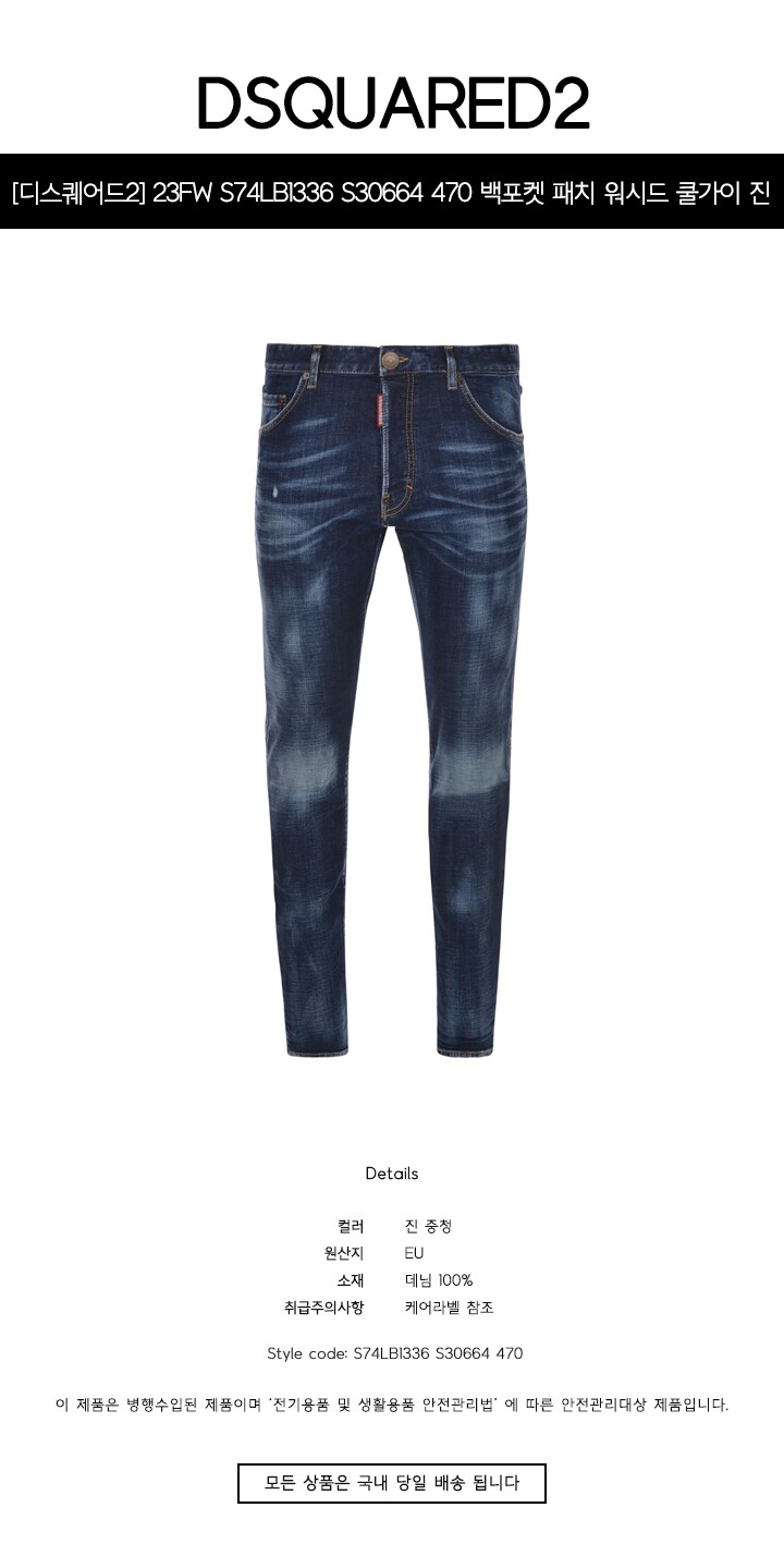 - #리본즈코리아 #S74LB1336S30664470 #[명품] #23FW #S74LB1336 #S30664 #470 #백포켓 #패치 #워시드 #쿨가이 #진 #중청 #남성 #팬츠 #/ #의류 #하의 #청바지
