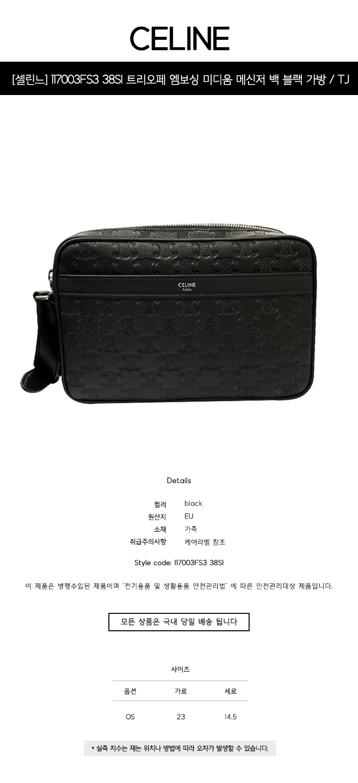 - #리본즈코리아 #117003FS338SI #[명품] #117003FS3 #38SI #트리오페 #엠보싱 #미디움 #메신저 #백 #블랙 #가방 #/ #공용 #가방/핸드백 #크로스/메신저백 #크로스백