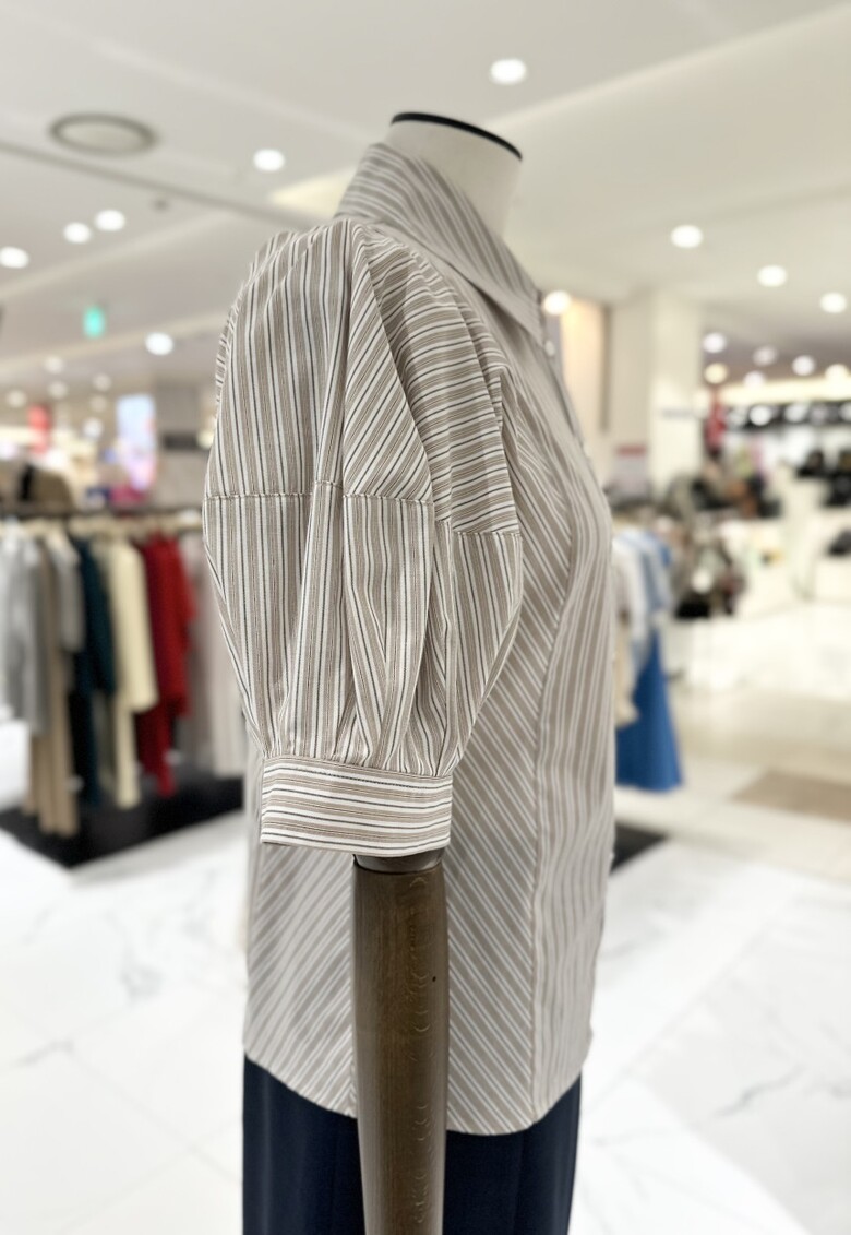 모조에스핀의 고급스러운 스트라이프 패턴과 셔링 디테일이 돋보여 다양한 하의와 조화롭게 어울립니다. 슬랙스와 매치해 단정한 오피스룩을, 청바지와 매치해 여성스러운 캐주얼룩을 연출해 보세요.
