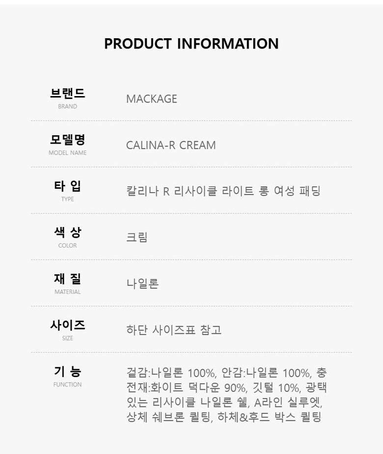 [명품] 맥케이지 CALINA R CREAM 칼리나 R 리사이클 라이트 롱 여성 패딩