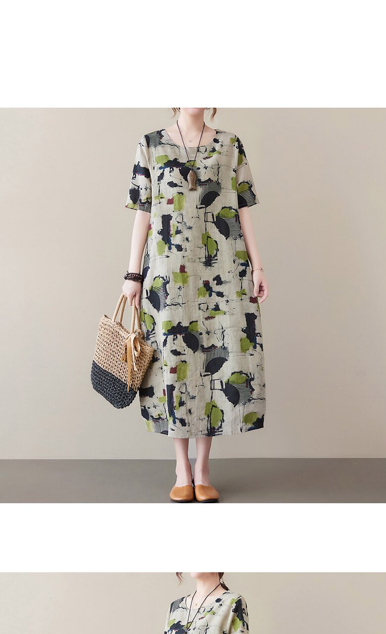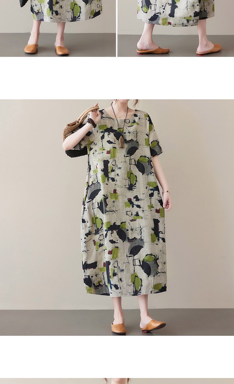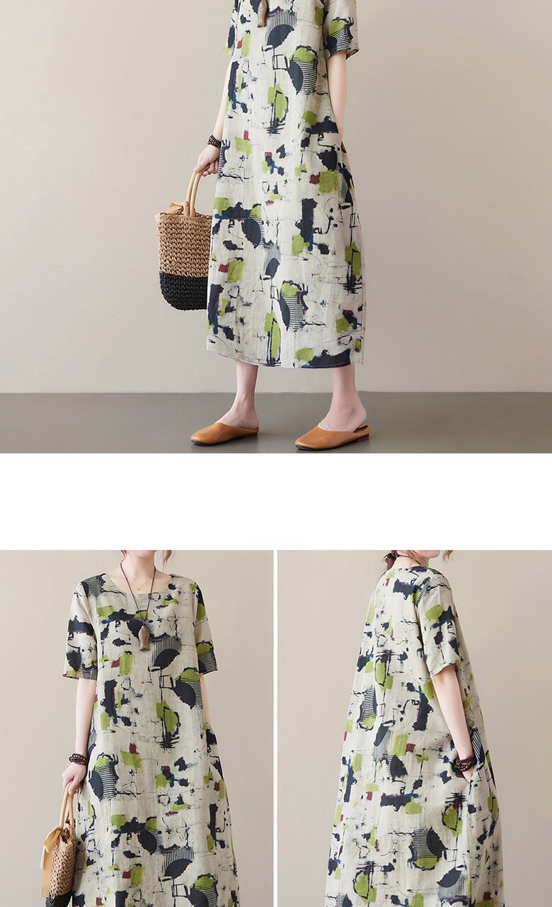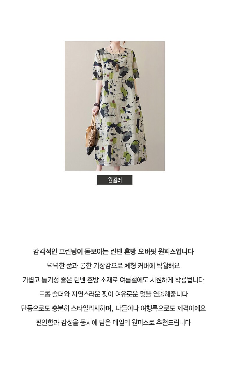 비베 오버핏 프린팅 반팔 린넨 롱 원피스