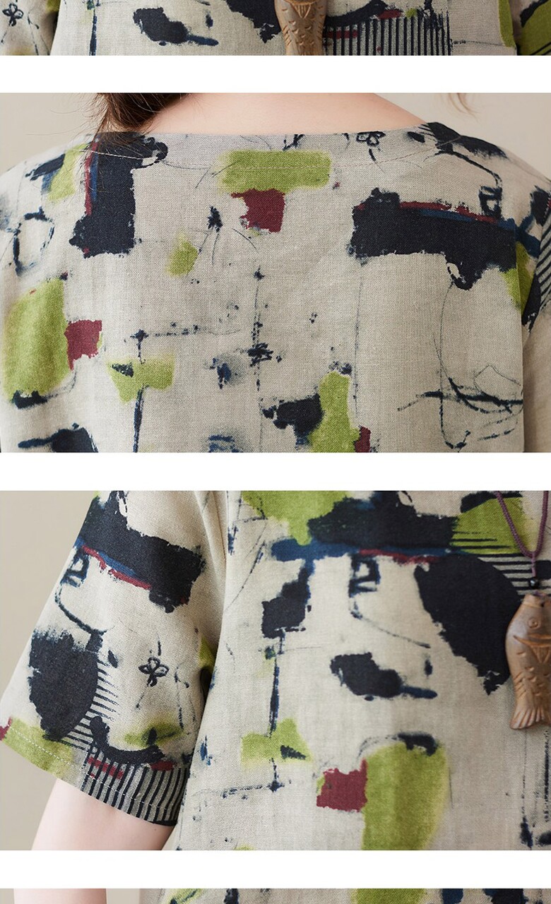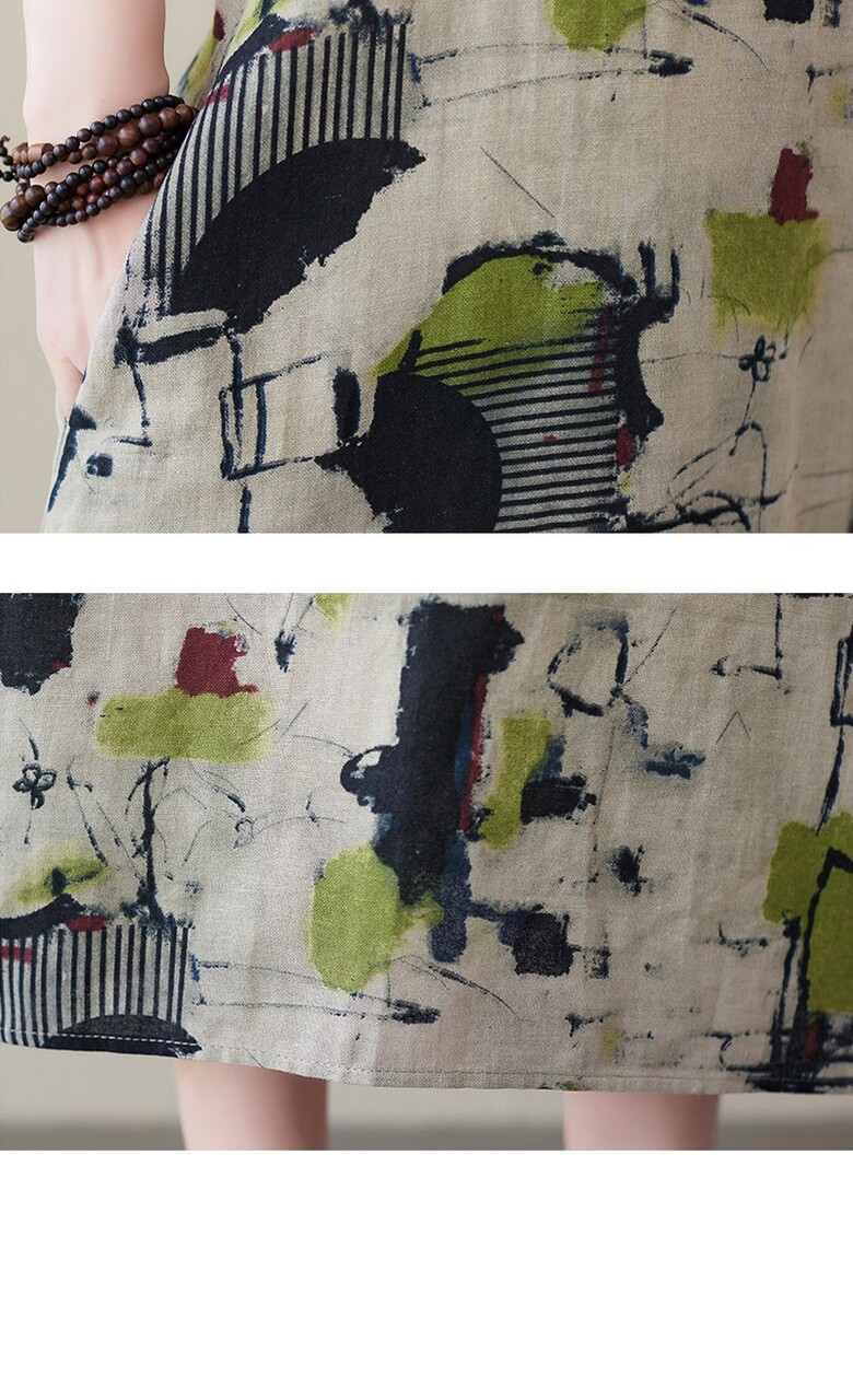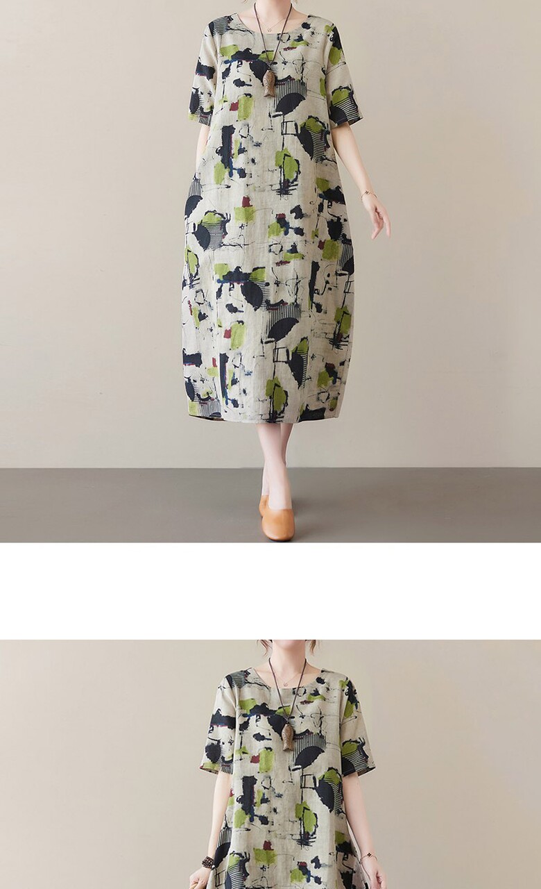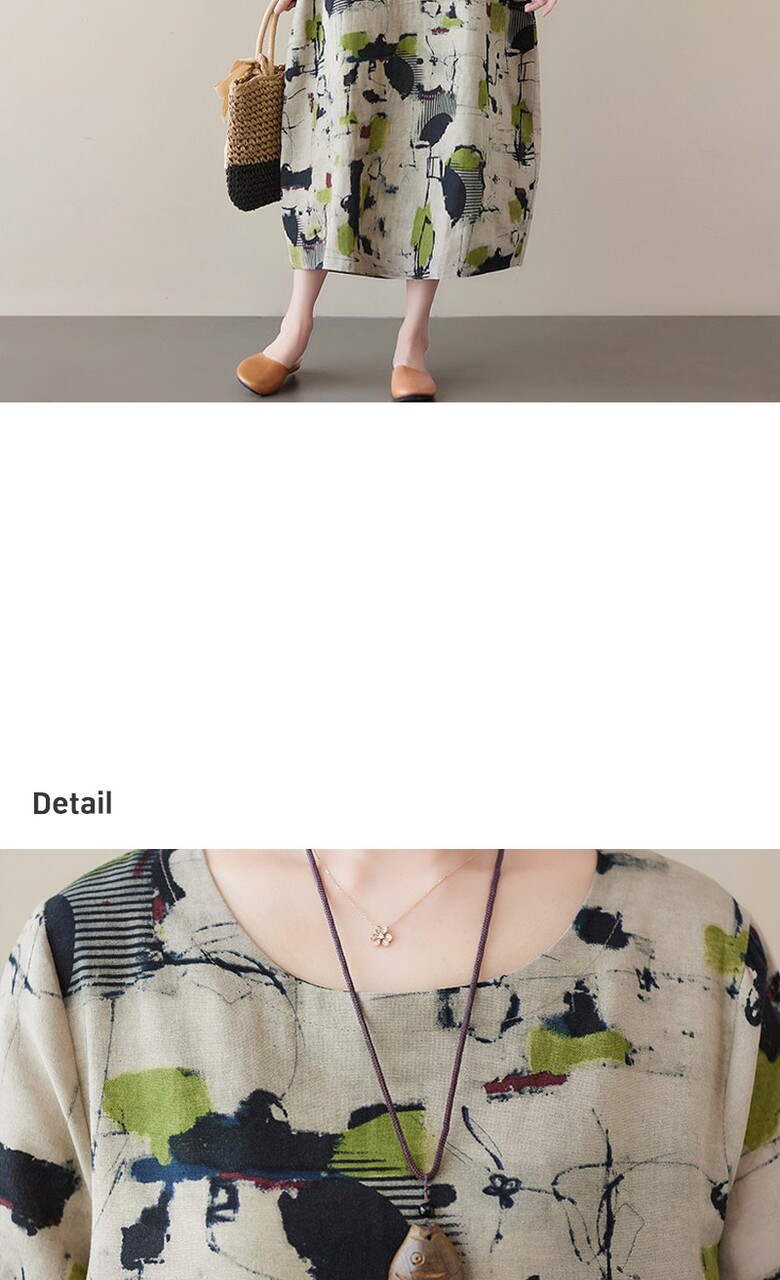 비베 오버핏 프린팅 반팔 린넨 롱 원피스