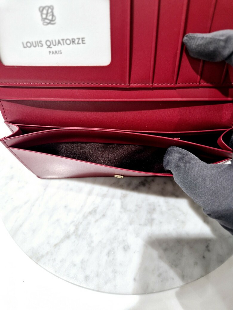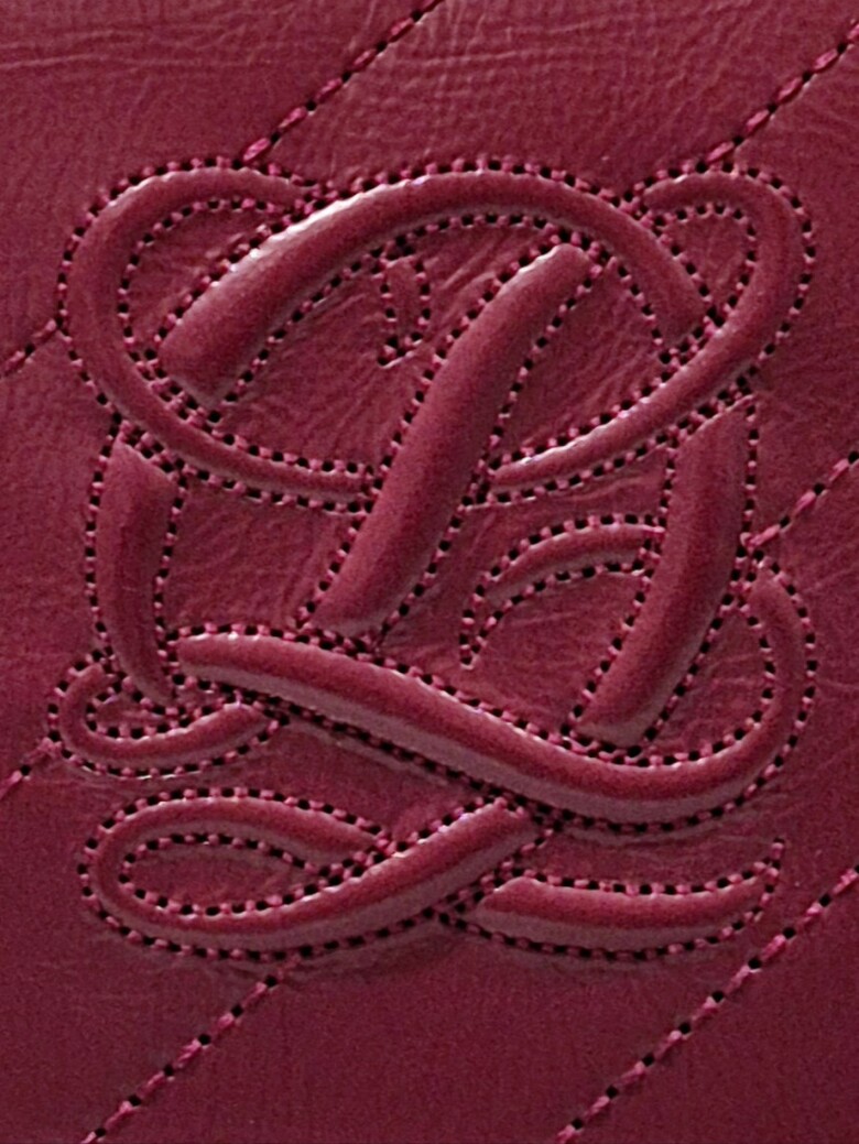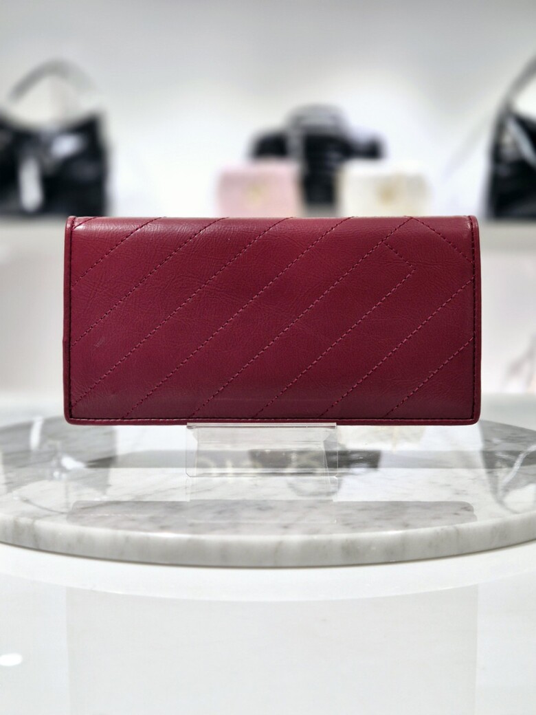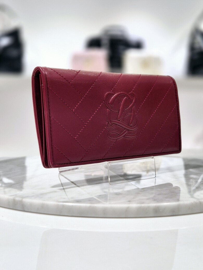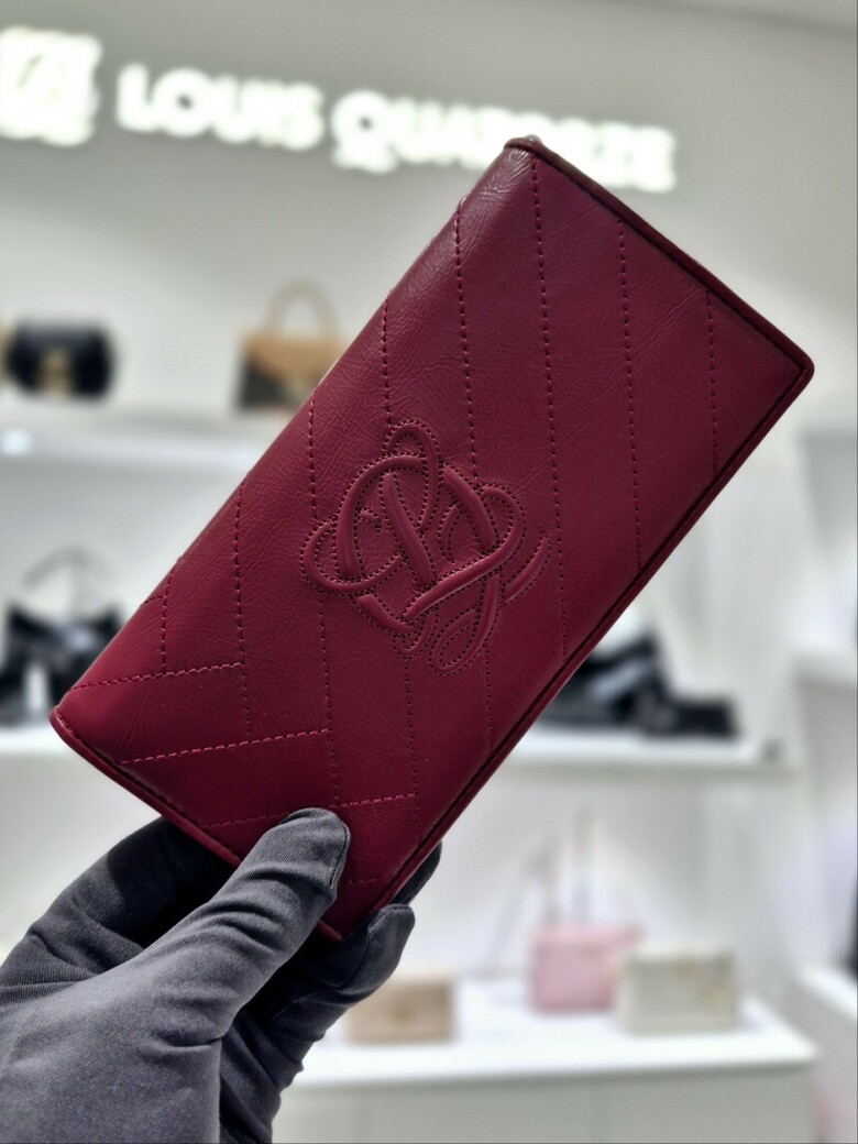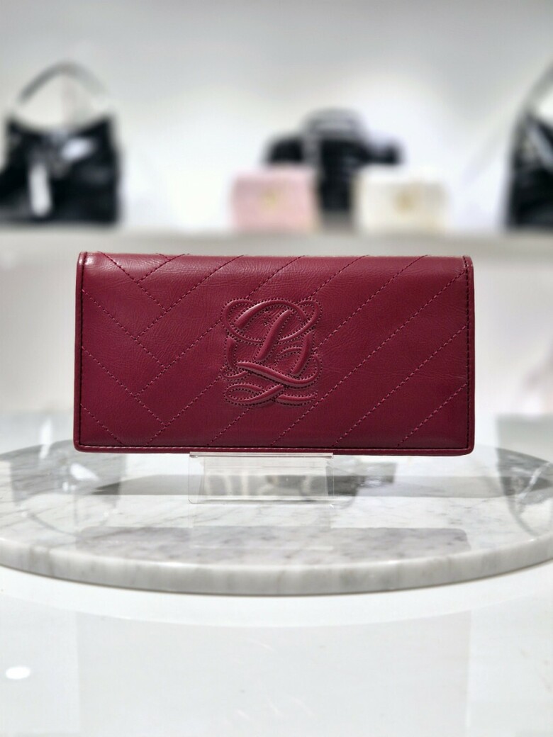 볼륨감있는 심볼 자수가 포인트 되는 페미닉 무드의 크랙 소재 장지갑.