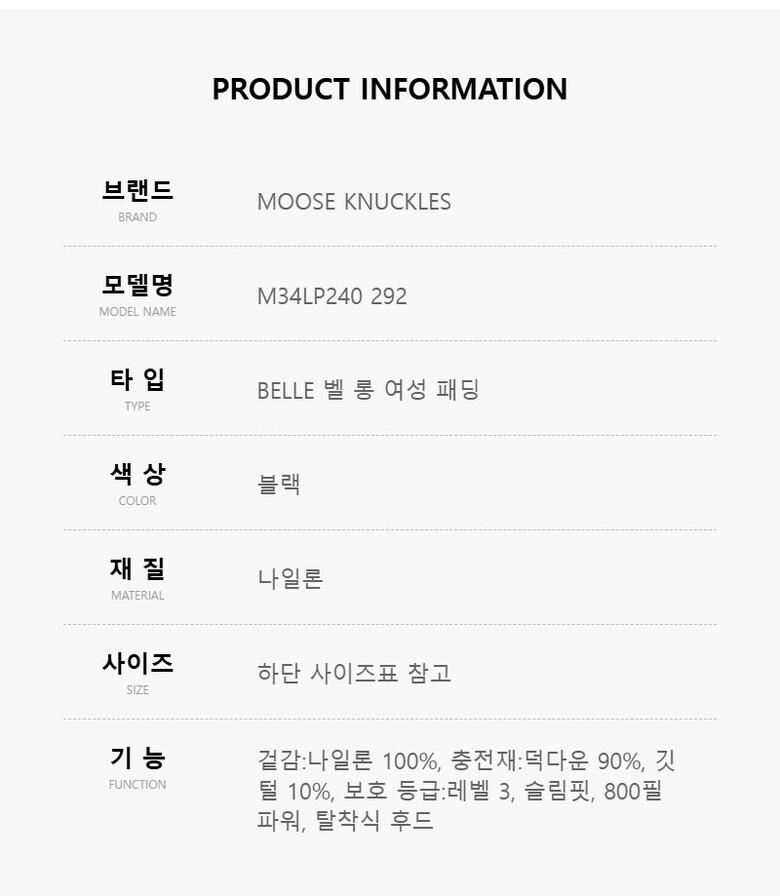 [명품] 무스너클 M34LP240 292 BELLE 벨 롱 여성 패딩