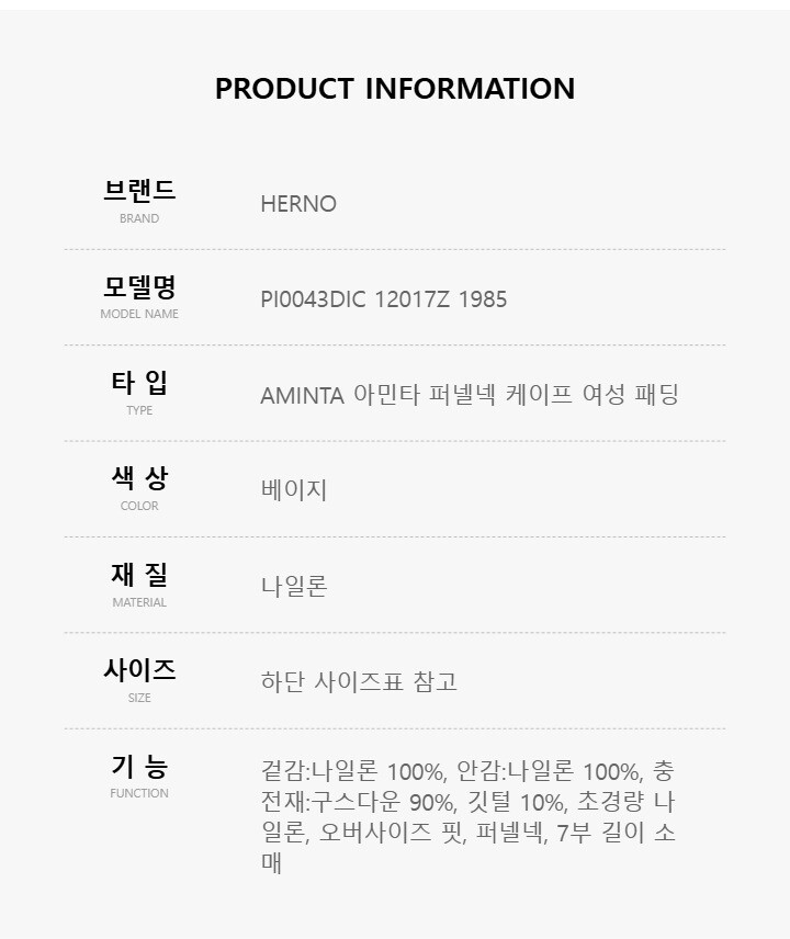 | 1. 제품 소재 (섬유의 조성 또는 혼용률을 백분율로 표시, 기능성인 경우 성적서 또는 허가서) | 상세페이지 참조 |