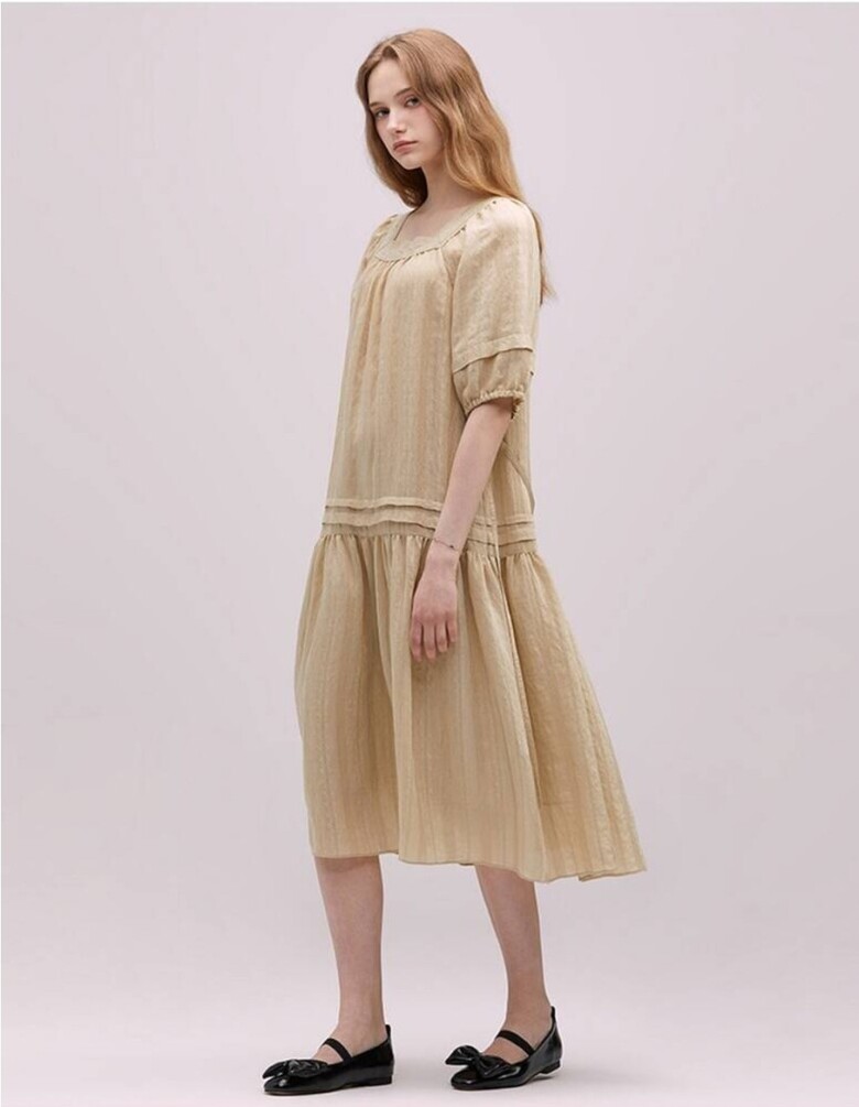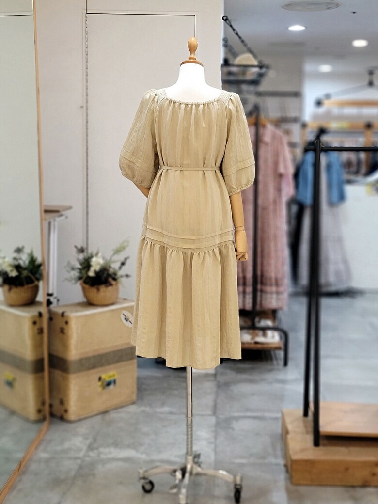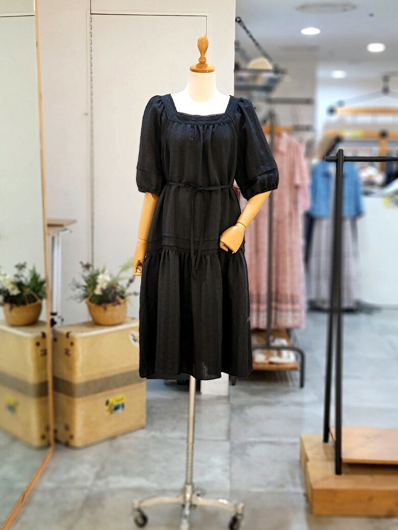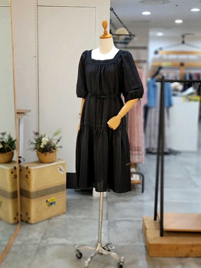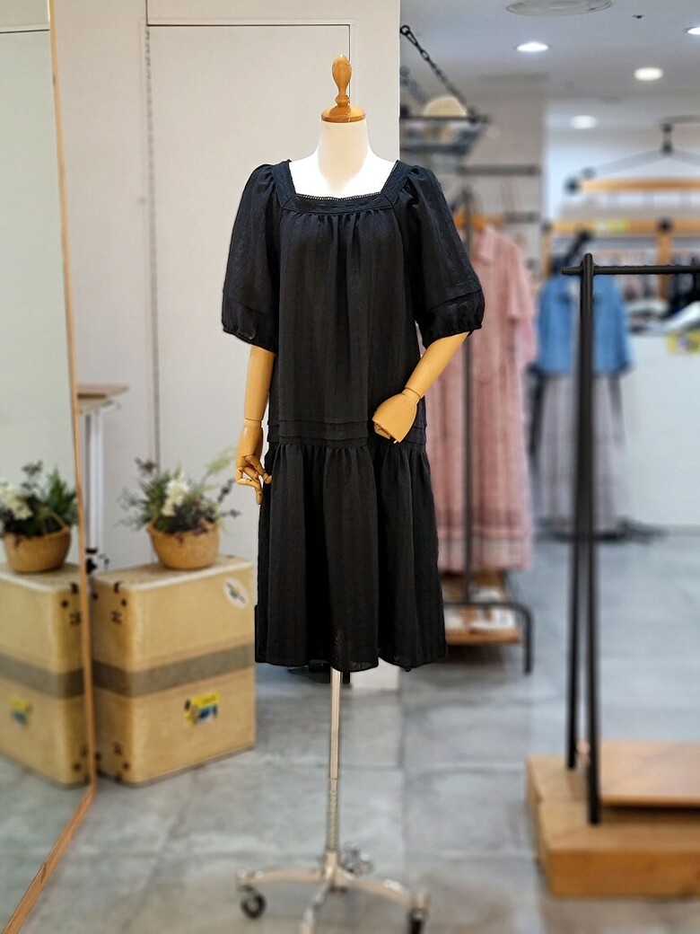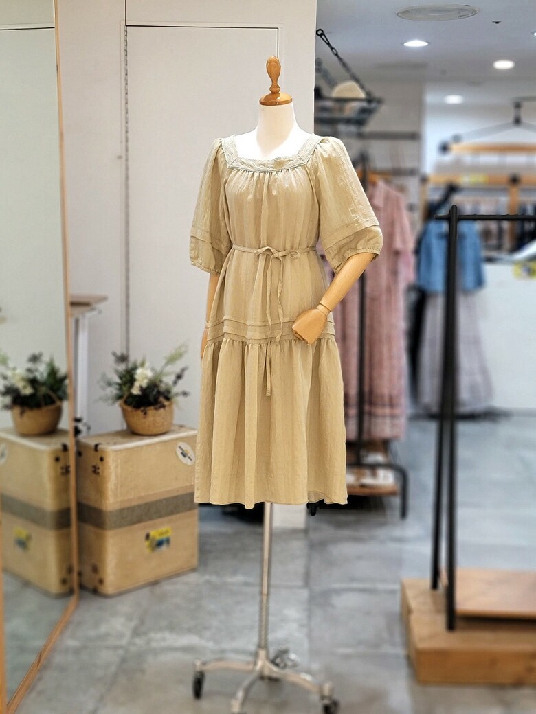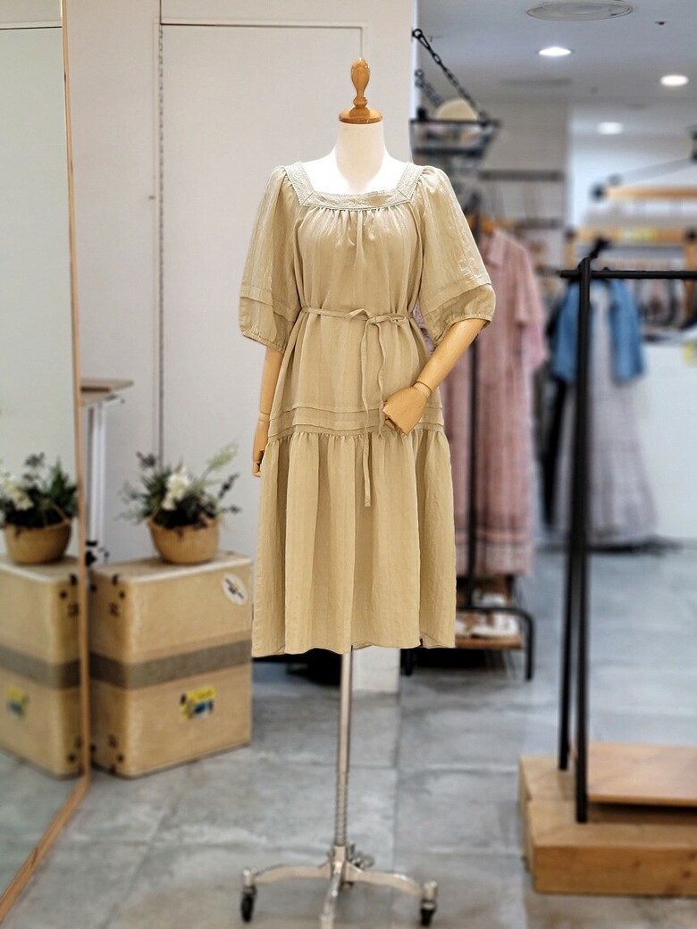 레이스 패치의 스퀘어넥과 터크 디테일로 포인트를 준 원피스입니다.