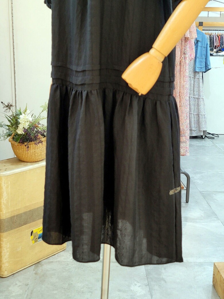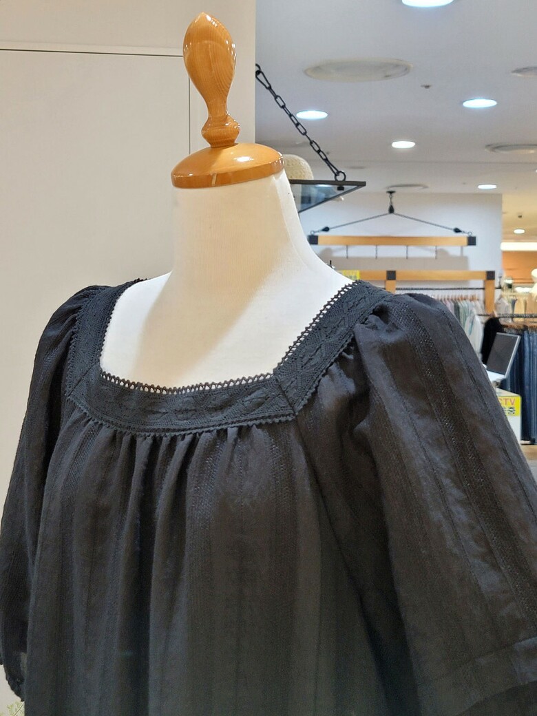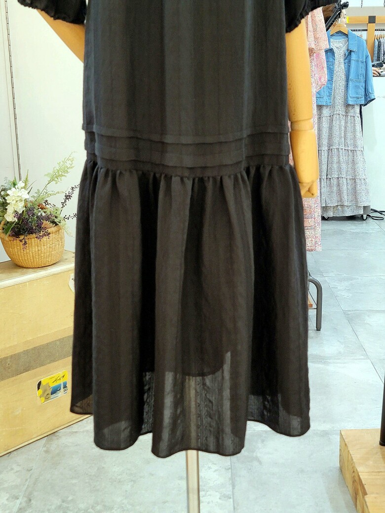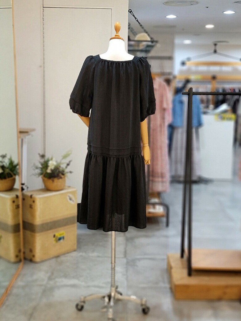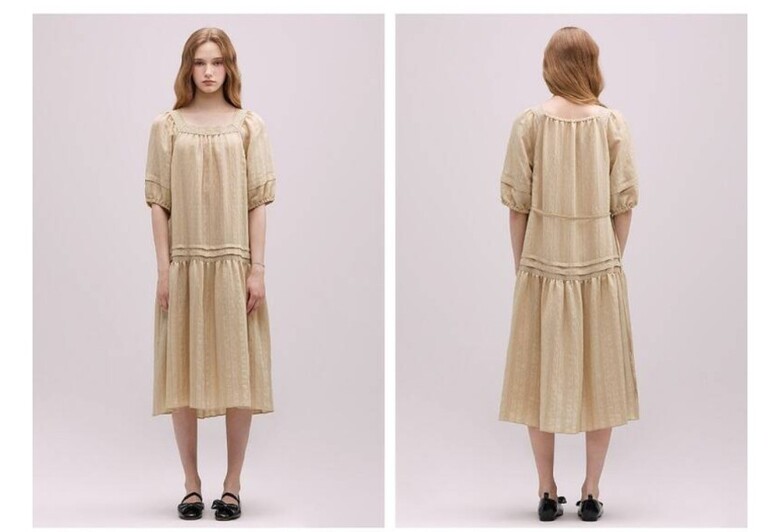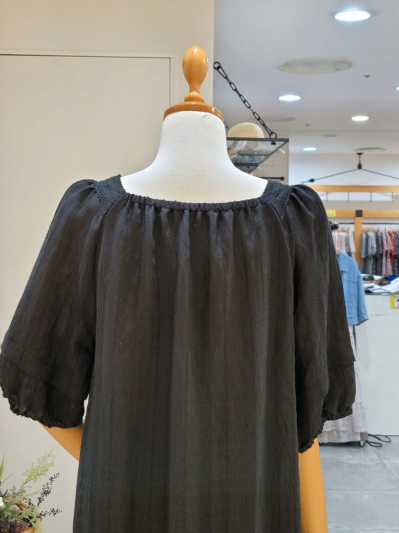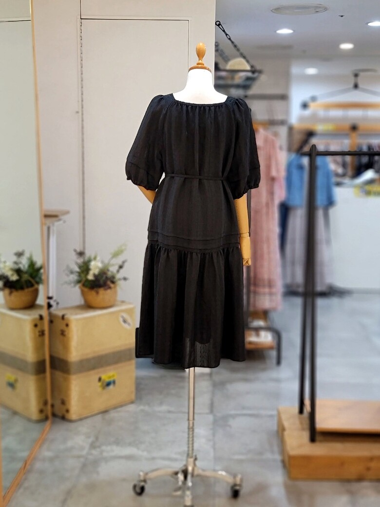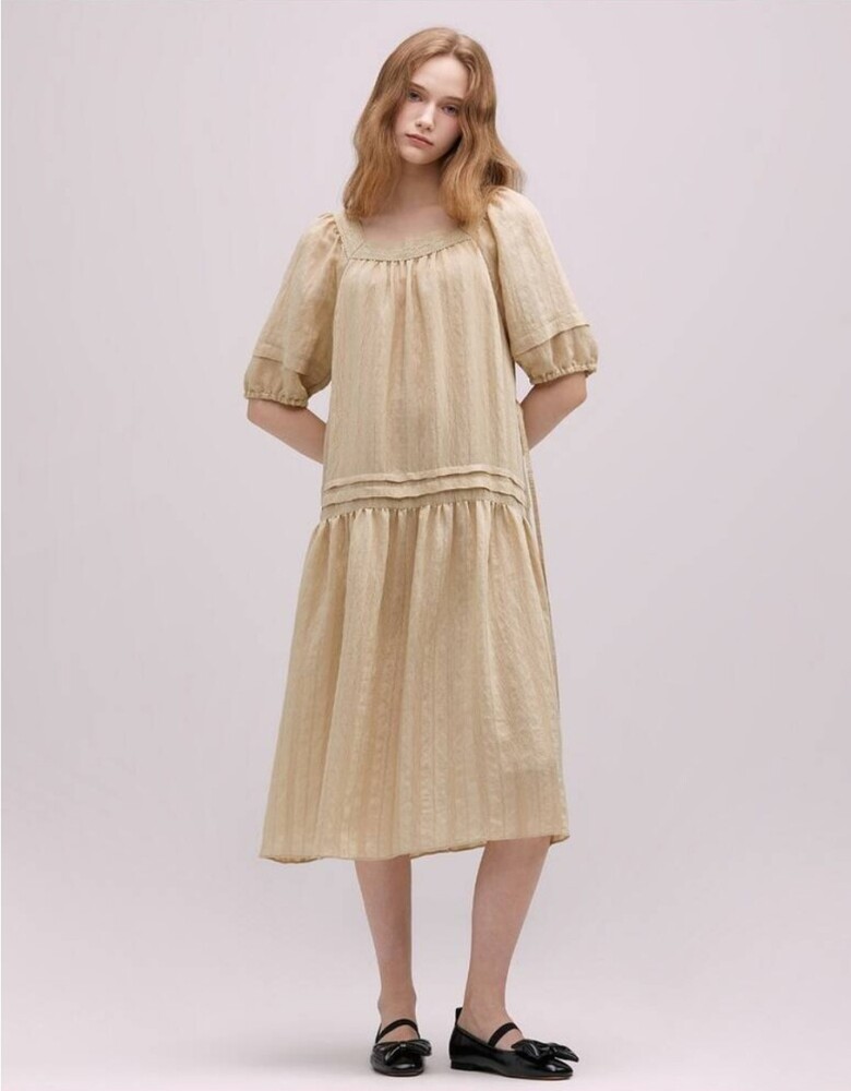 레이스 패치의 스퀘어넥과 터크 디테일로 포인트를 준 원피스입니다.