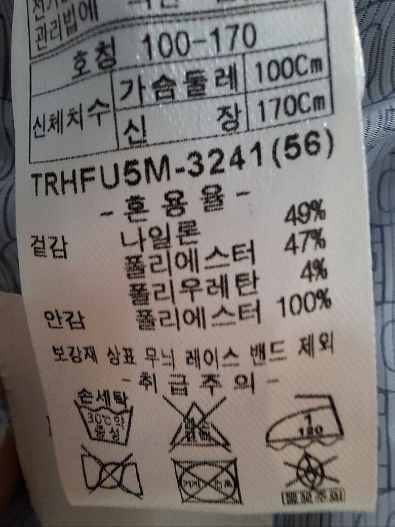 | 1. 제품 소재 (섬유의 조성 또는 혼용률을 백분율로 표시, 기능성인 경우 성적서 또는 허가서) | 겉감:나일론 49%, 폴리에스테르 47%, 폴리우레탄 4% / 안감:폴리에스 |