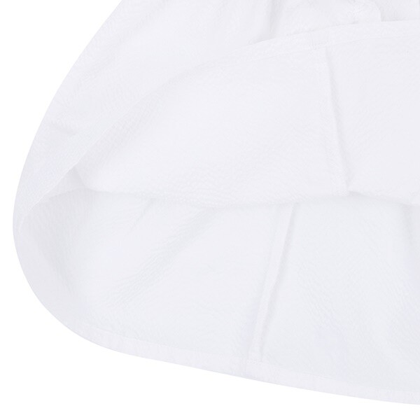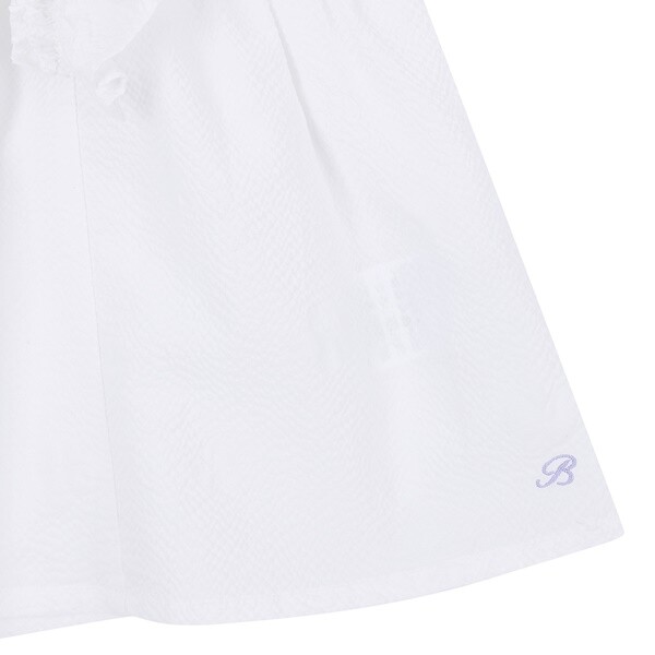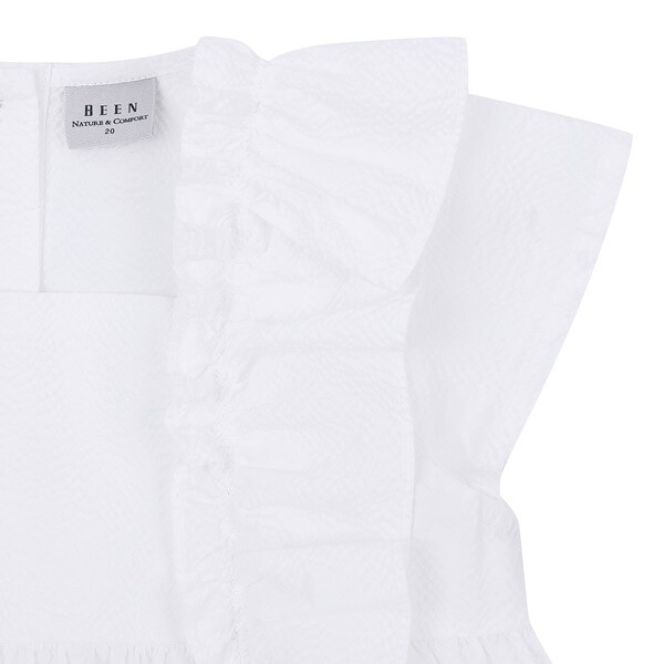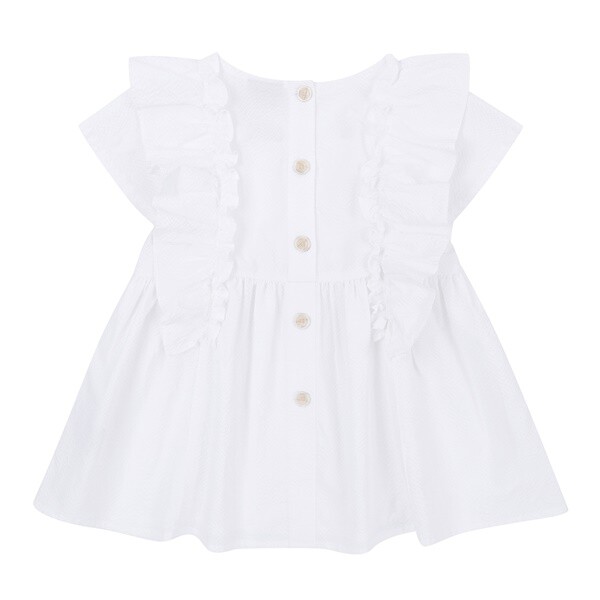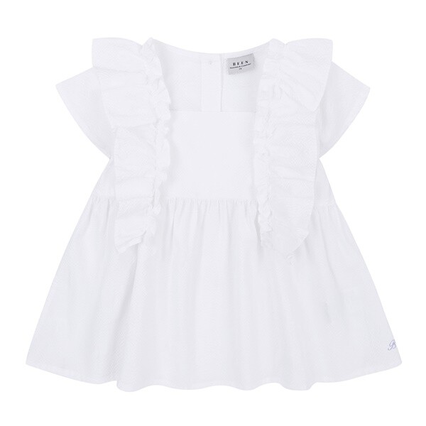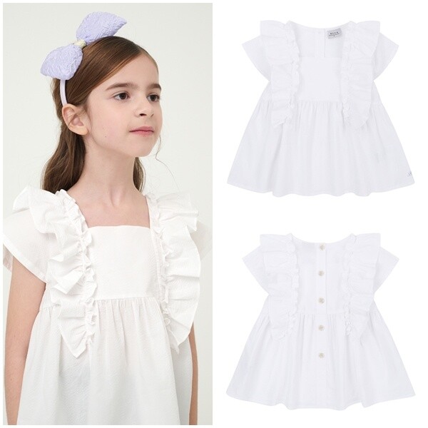 화이트 컬러의 퓨어한 여아 블라우스입니다. 섬세한 프릴 디테일에 어깨를 살짝 덮는 여성스러운 소매 라인과 힙을 덮는 기장감으로 제안하여 편안하면서도 세련된 스타일링을 연출할 수 있습니다.