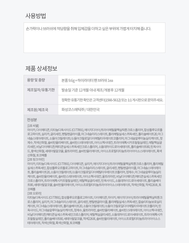| 9. 사용 시 주의사항 | 1. 화장품을 사용 중 붉은 반점, 부어오름, 가려움증, 자극 등의 이상이 있는 경우, 적용 부위가 직사광선에 의하여 이상이 생긴 경우 사용을 중지하시고 피부과 전문의와 상담하세요. 2. 상처가 있는 부위, 습진 및 피부염 등의 이상이 있는 부위에는 사용하지 마세요. 117. 보관 및 취급시 주의사항 가)사용 후에는 반드시 마개를 닫아두세요. 나)유아ㆍ소아의 손이 닿지 않는 곳에 보관하세요. 다)고온 다습한 곳 및 직사광선 닿는 장소는 피해주세요. |