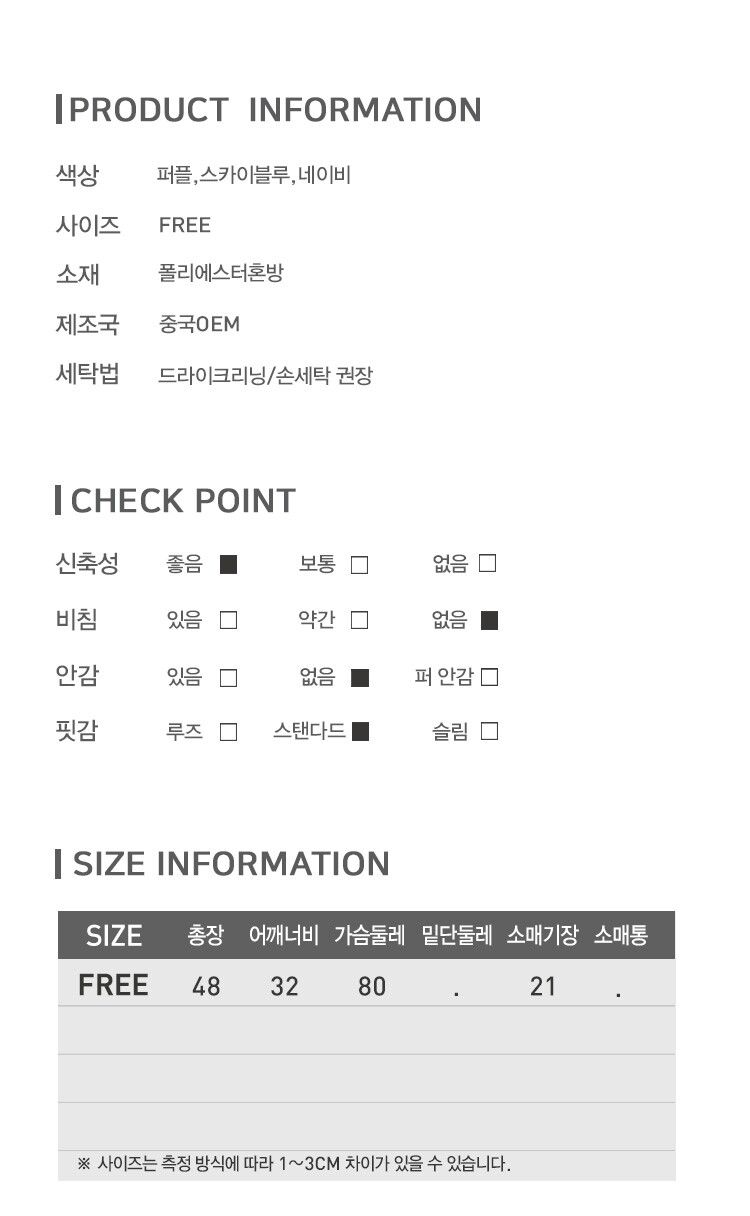 | 1. 제품 소재 (섬유의 조성 또는 혼용률을 백분율로 표시, 기능성인 경우 성적서 또는 허가서) | 상세페이지참고 |