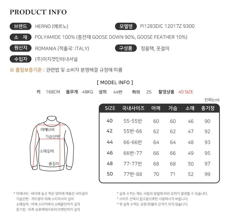 | 1. 제품 소재 (섬유의 조성 또는 혼용률을 백분율로 표시, 기능성인 경우 성적서 또는 허가서) | 상세페이지 참조 |