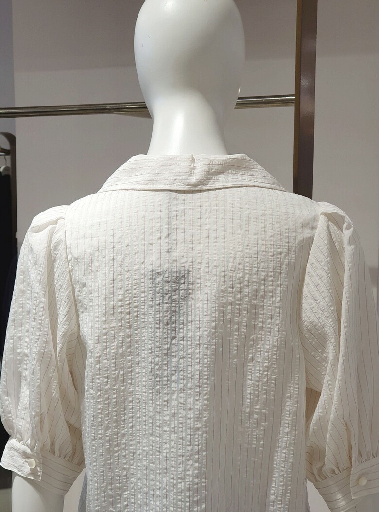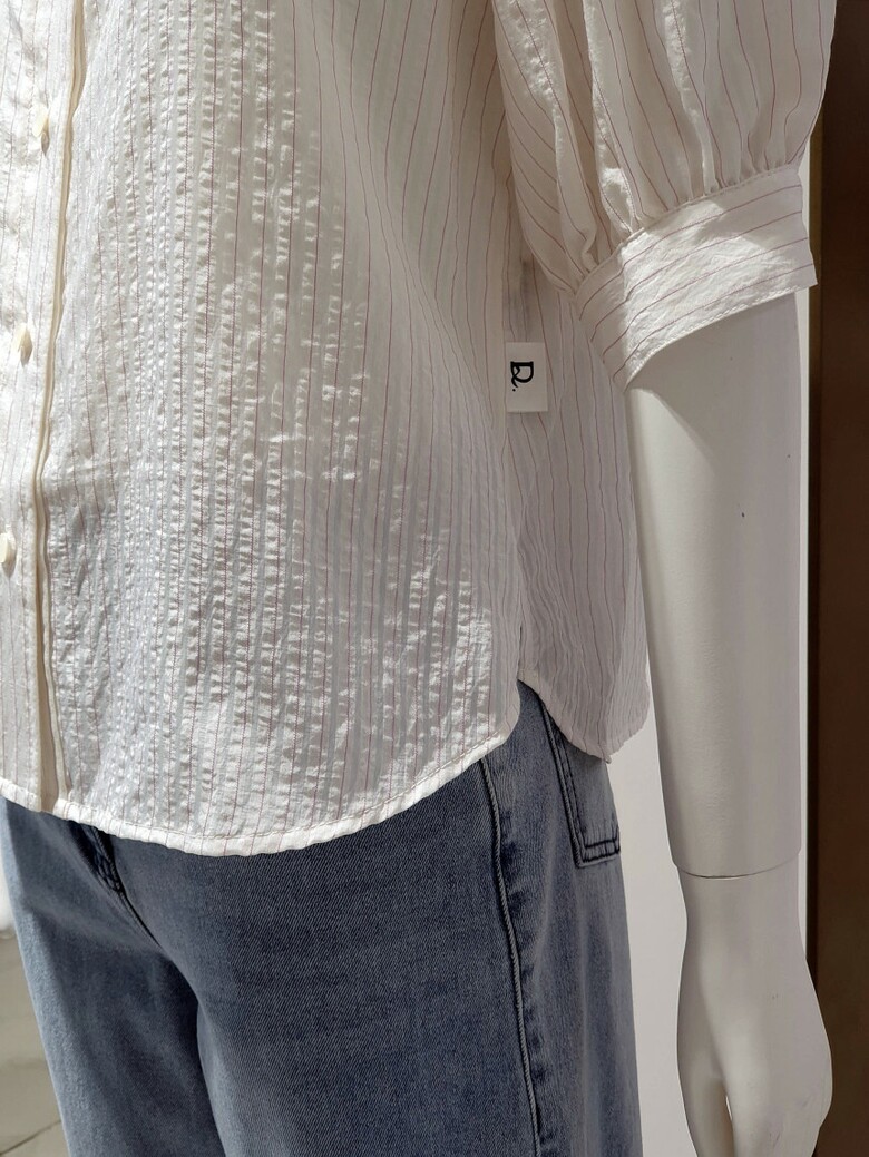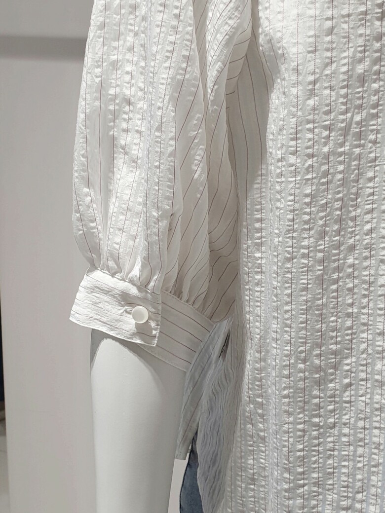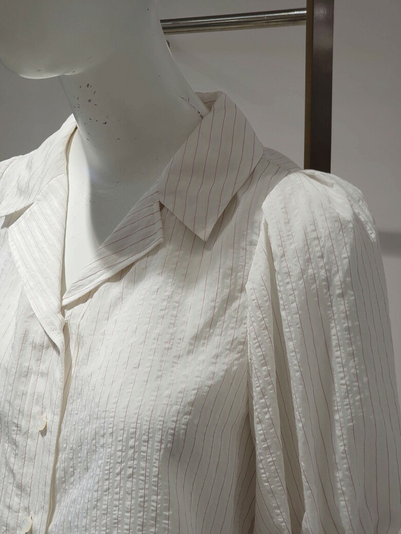 스트라이프 패턴에 볼륨 소매로 여성스러운 무드의