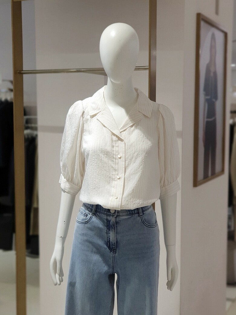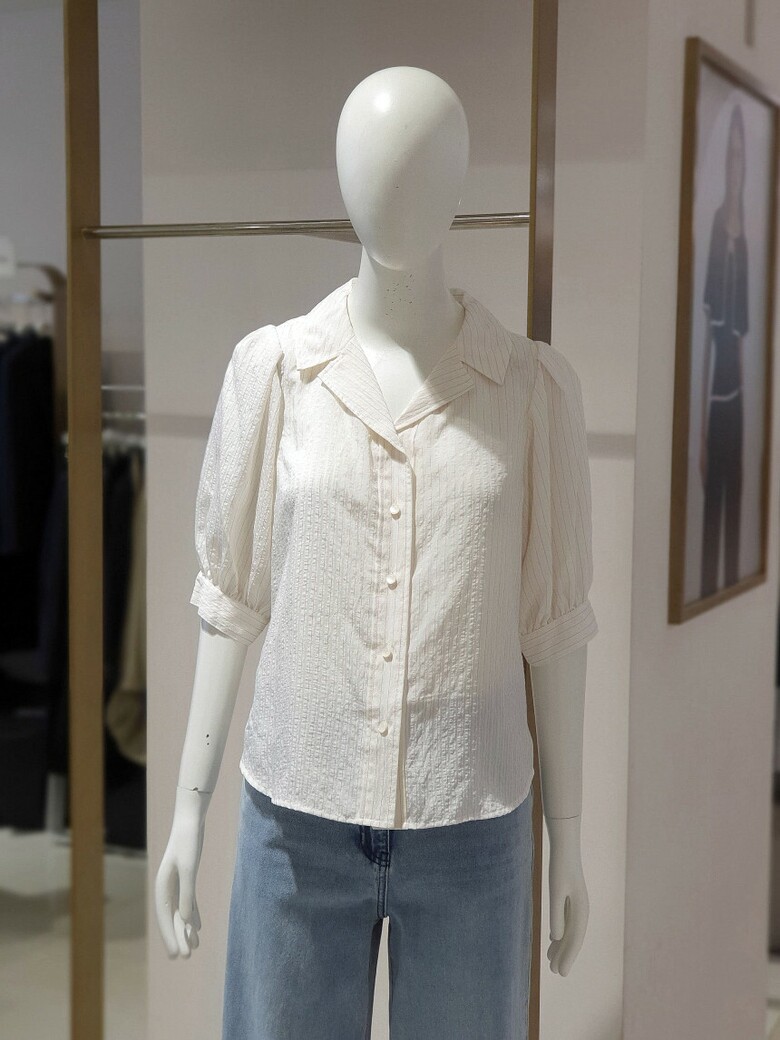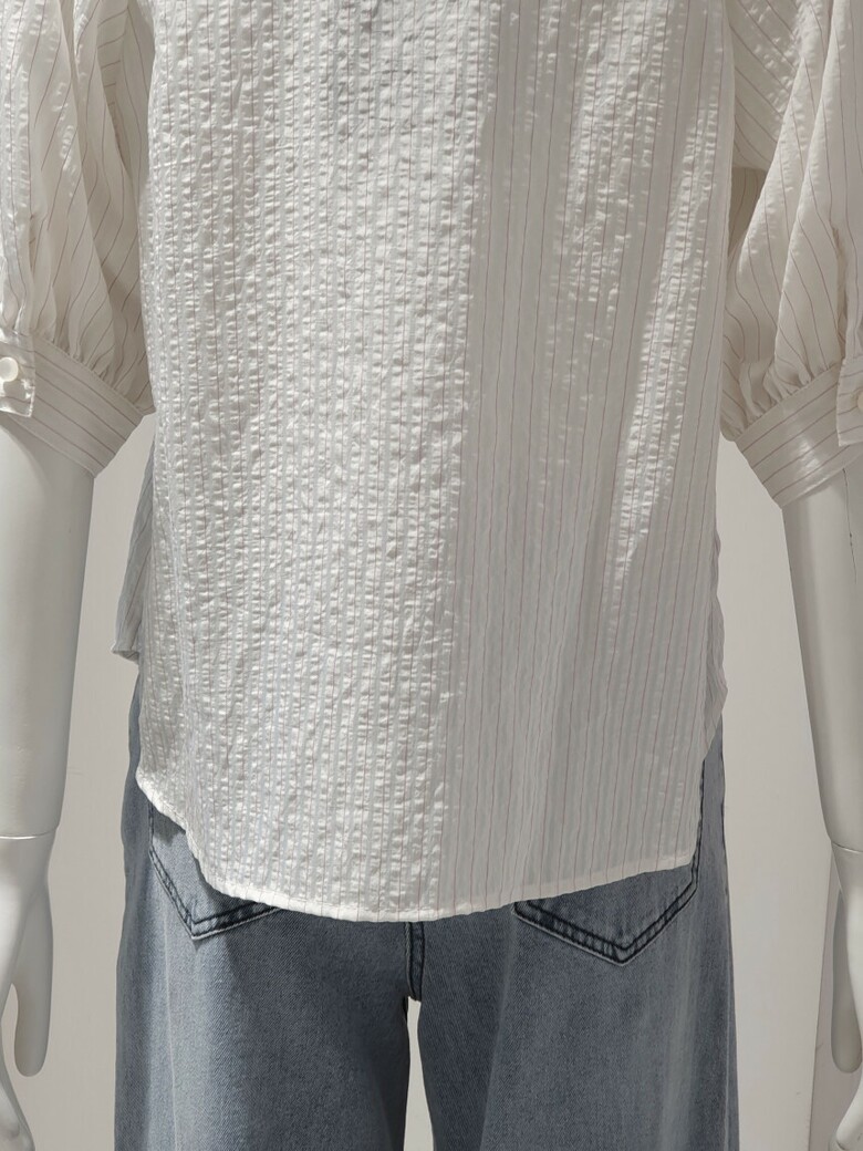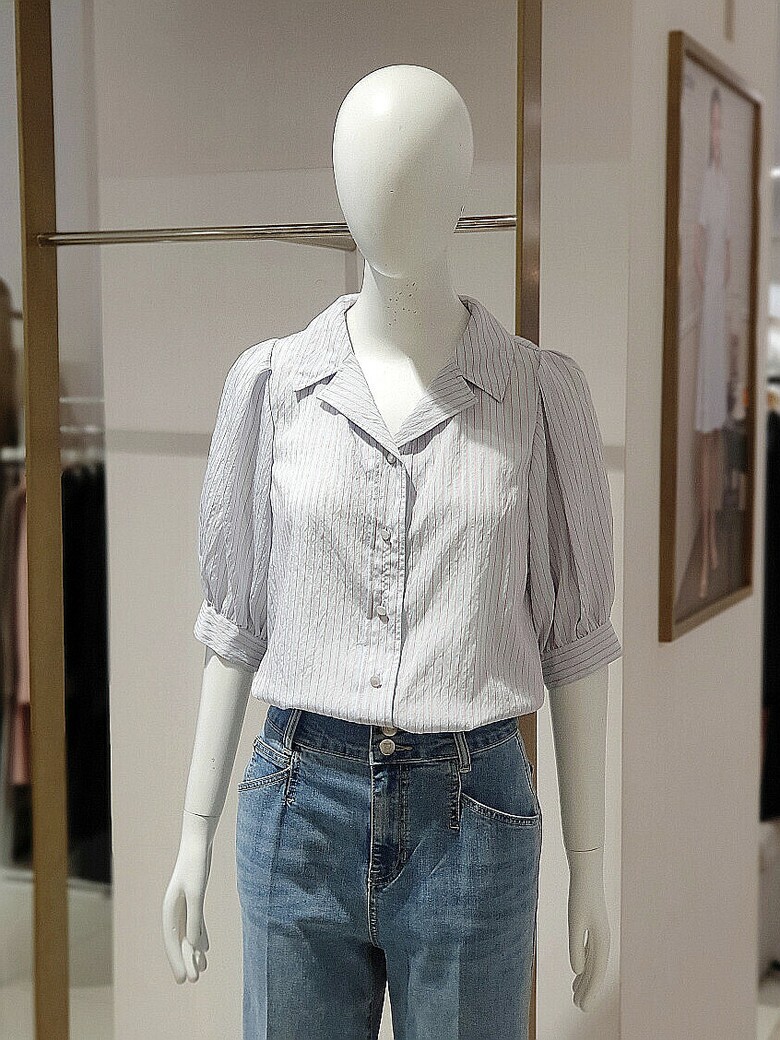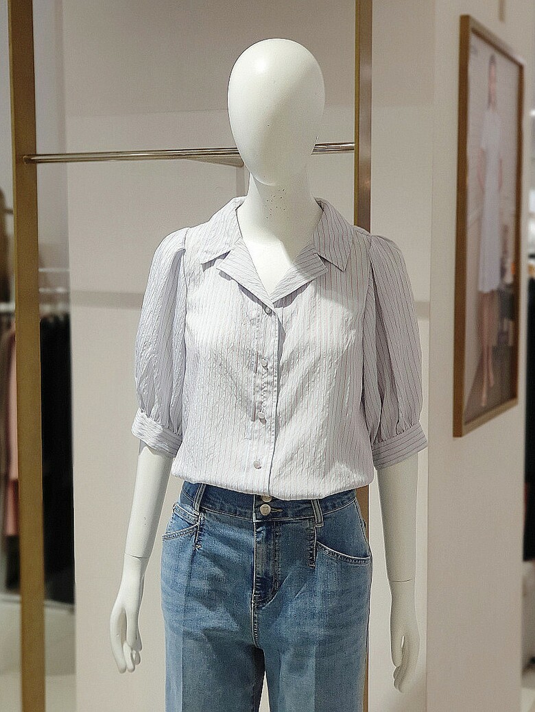 스트라이프 패턴에 볼륨 소매로 여성스러운 무드의