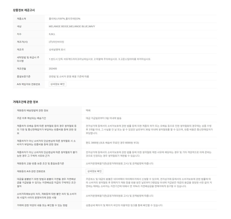 1. 제품 소재 (섬유의 조성 또는 혼용률을 백분율로 표시, 기능성인 경우 성적서 또는 허가서) | 상품상세참조 |