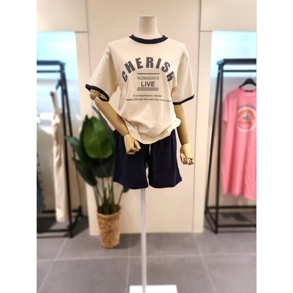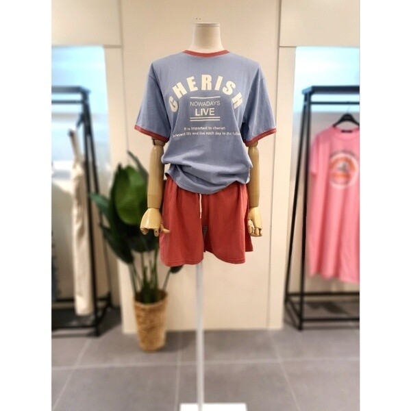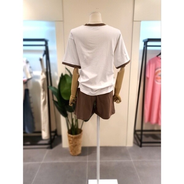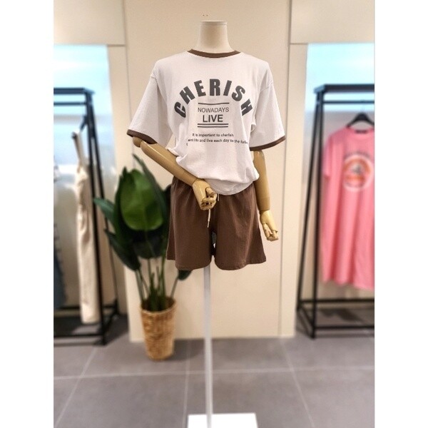 면소재의 반팔 반바지 세트입니다.링거 디자인에 캐주얼한 배색 프린팅으로 캐주얼합니다.