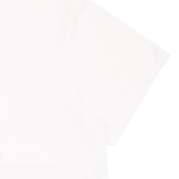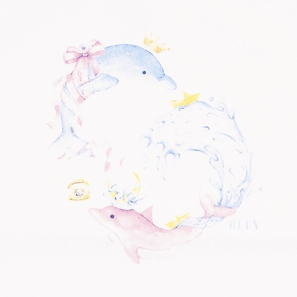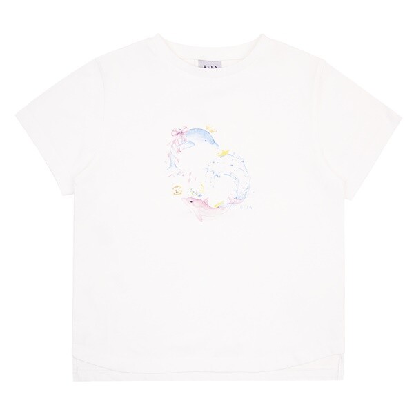 밝고 클린한 화이트 컬러의 반소매 티셔츠입니다. 반짝이는 바닷속에서 환상적인 느낌의 돌고래가 춤을 추는 듯한 프린트로 포인트를 주어 유니크한 느낌을 더해주었습니다.