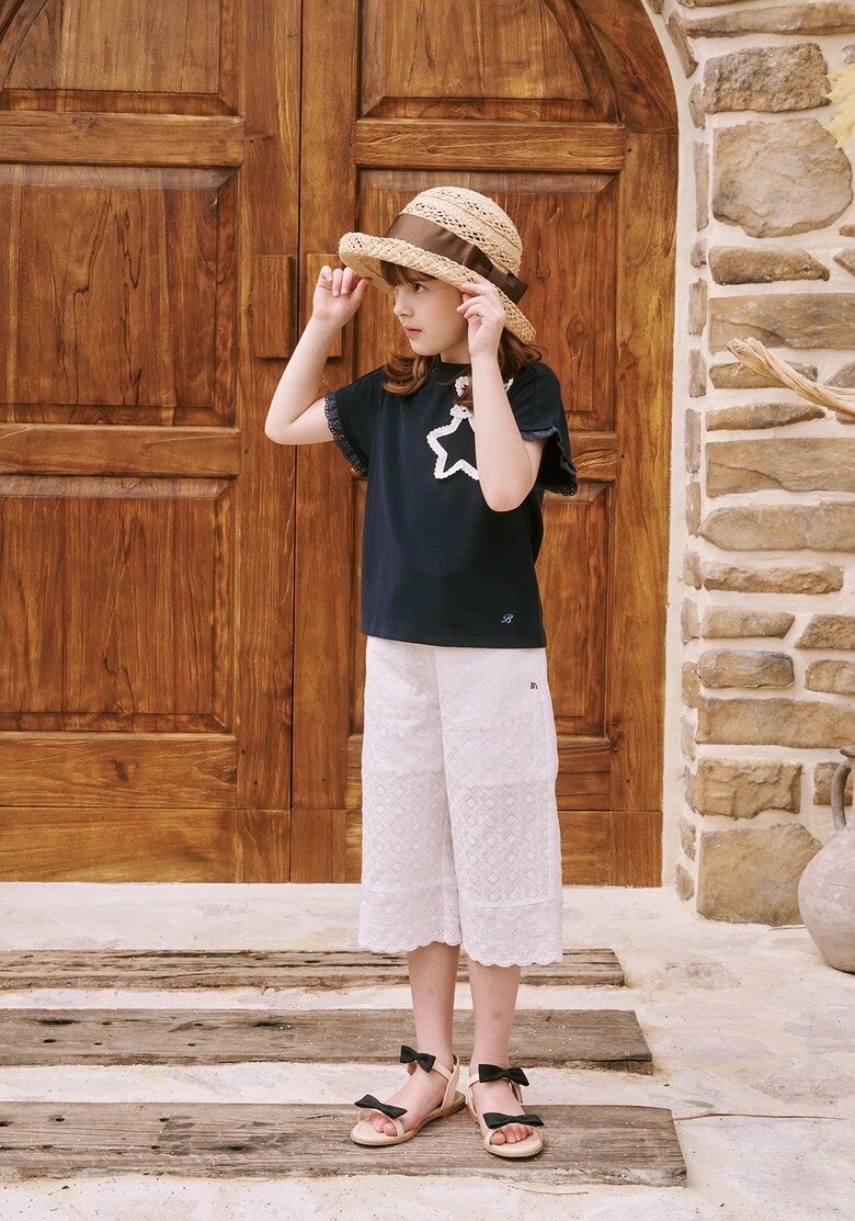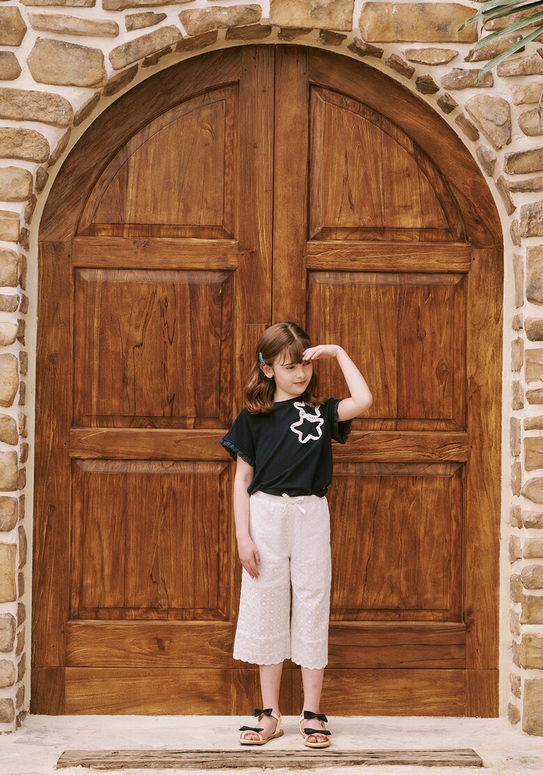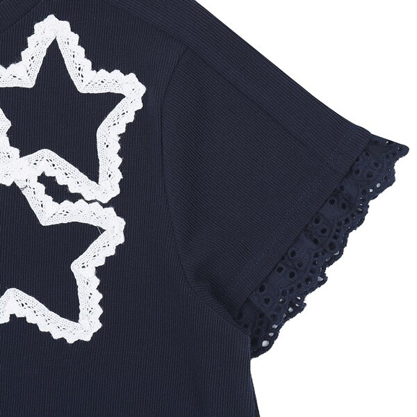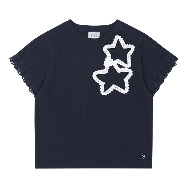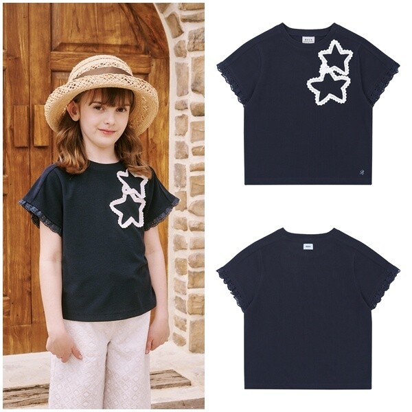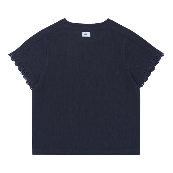 네이비 컬러에 레이스 소매와 모티브 장식을 주어 시원하고 여성스러운 스타일링 포인트를 주는 레이스 티셔츠입니다.