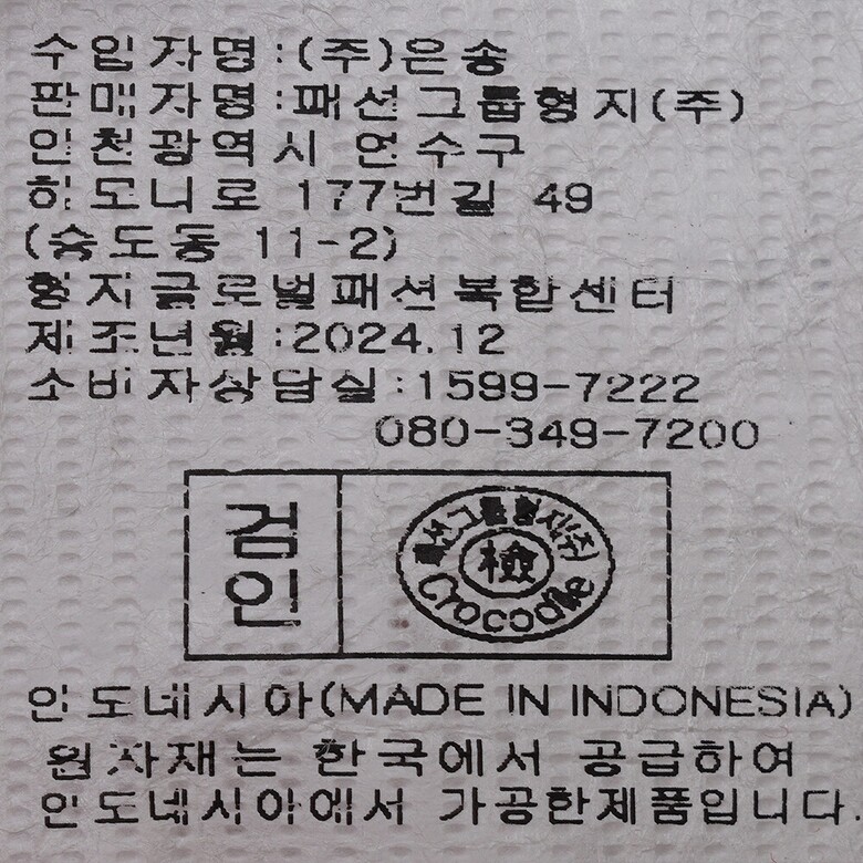 | 1. 제품 소재 (섬유의 조성 또는 혼용률을 백분율로 표시, 기능성인 경우 성적서 또는 허가서) | 상품상세참조 |