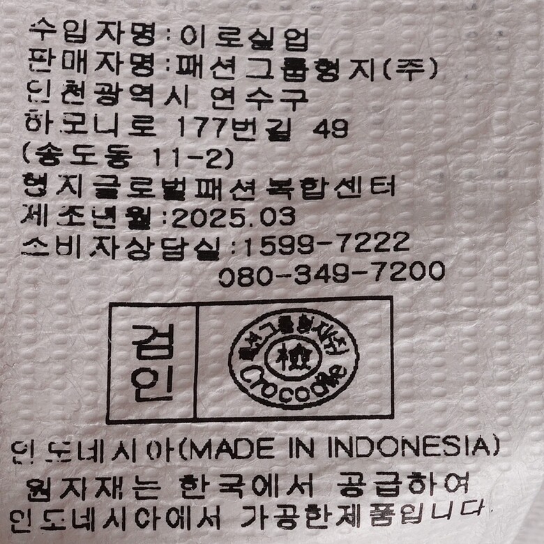 | 1. 제품 소재 (섬유의 조성 또는 혼용률을 백분율로 표시, 기능성인 경우 성적서 또는 허가서) | 상품상세참조 |