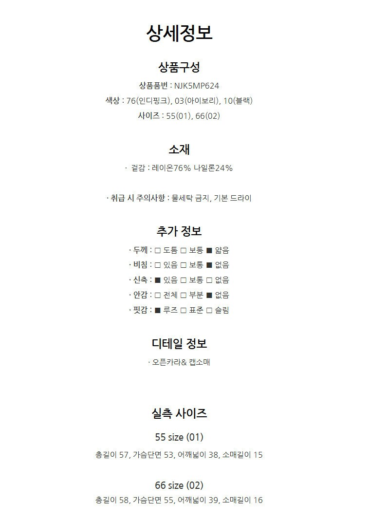 | 1. 제품 소재 (섬유의 조성 또는 혼용률을 백분율로 표시, 기능성인 경우 성적서 또는 허가서) | 겉감:레이온 76%, 나일론 24% |