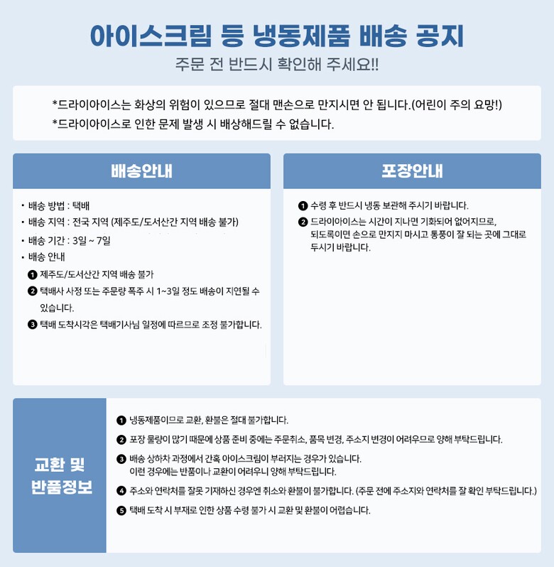 | 4. 생산일자,유통기한 | 1.냉장:상시제조/소비기한은 제조 일자로부터 7일 입니다.2.실온/냉동 제조연월일 :상시 제조 상품으로 잔여 소비기한이 3분의 1이상인 제품으로 출고되고 있으며, 소비 기한이 비교적 짧은 제품은 최소 13달이상 남은 제품으로 출고됩니다. |