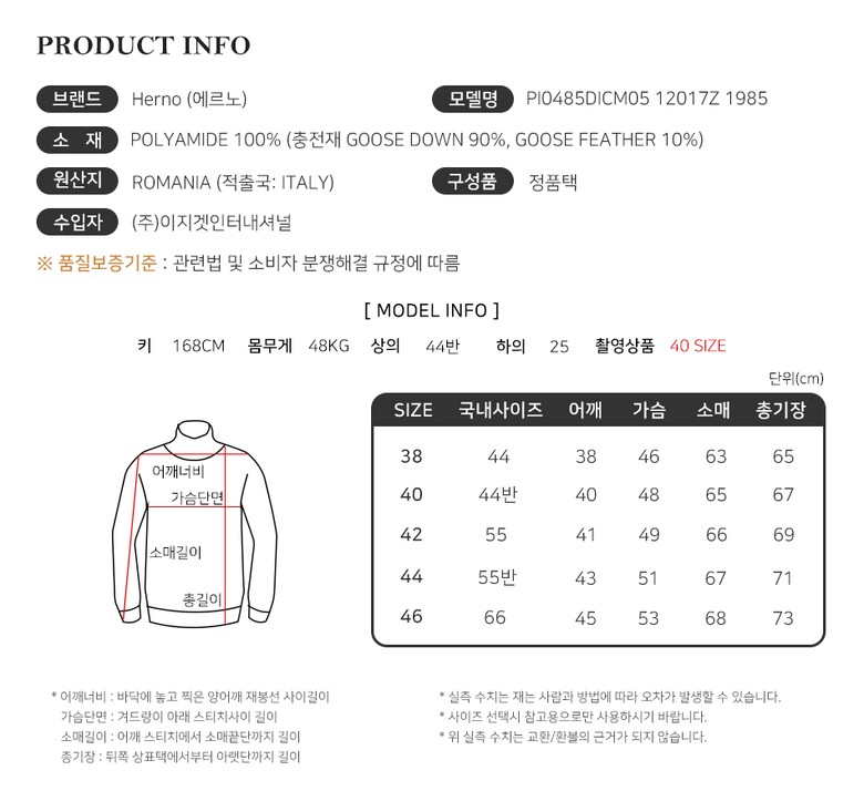| 1. 제품 소재 (섬유의 조성 또는 혼용률을 백분율로 표시, 기능성인 경우 성적서 또는 허가서) | 상세페이지 참조 |