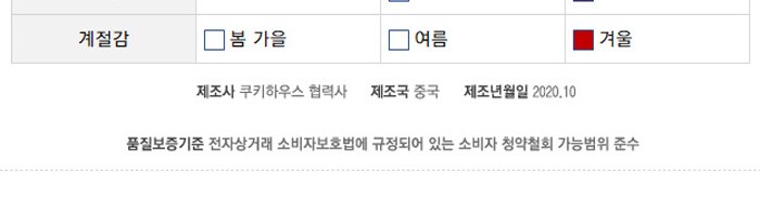 1. 제품 소재 (섬유의 조성 또는 혼용률을 백분율로 표시, 기능성인 경우 성적서 또는 허가서) | 상세페이지참조 |