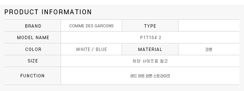 | 1. 제품 소재 (섬유의 조성 또는 혼용률을 백분율로 표시, 기능성인 경우 성적서 또는 허가서) | 상세페이지 참조 |