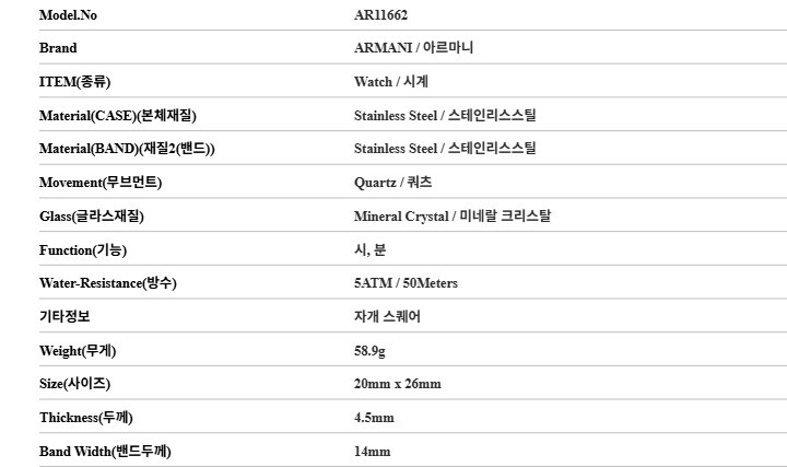 | 7. 주요 사양 | 스테인리스스틸 시계 쿼츠 |