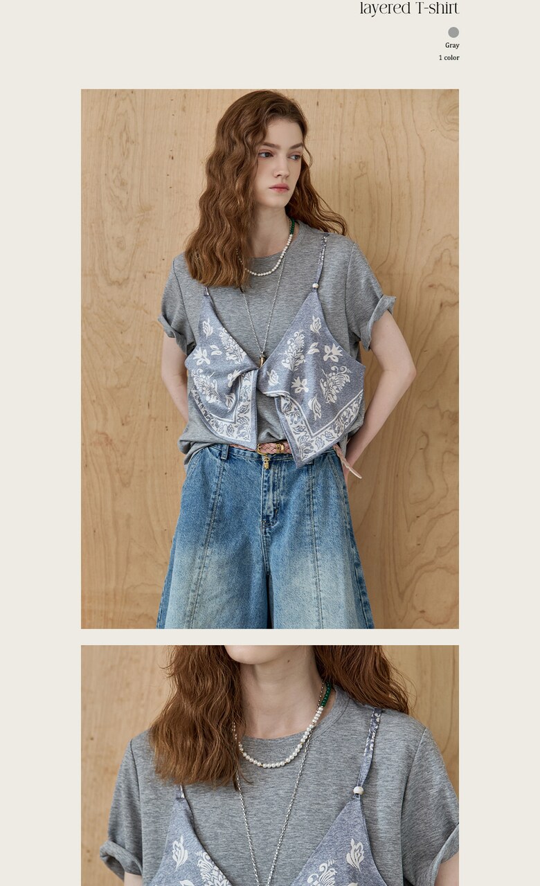 레이어드 한 듯한 디자인의 반팔 티셔츠입니다.