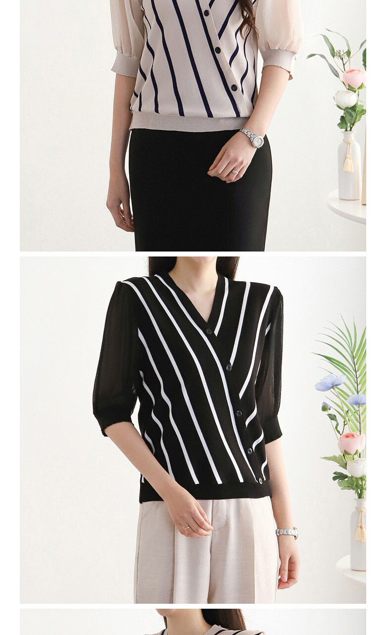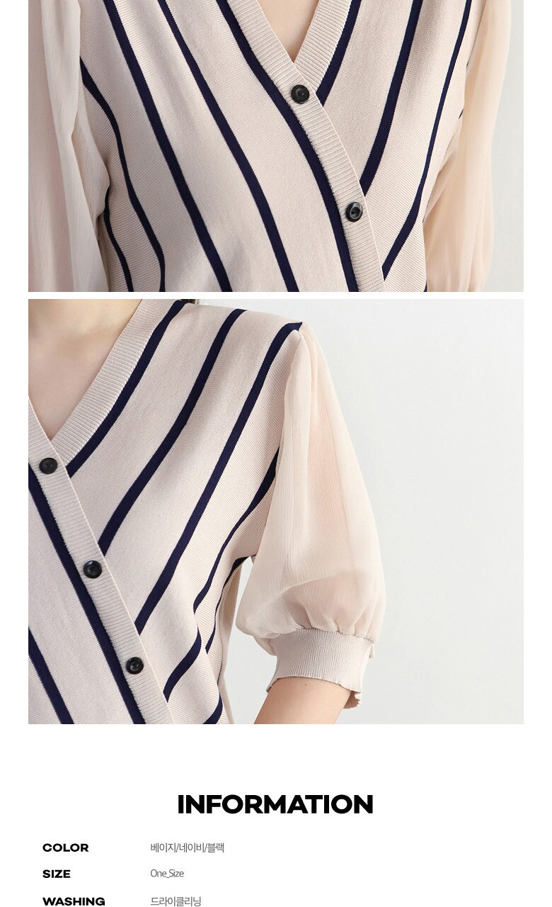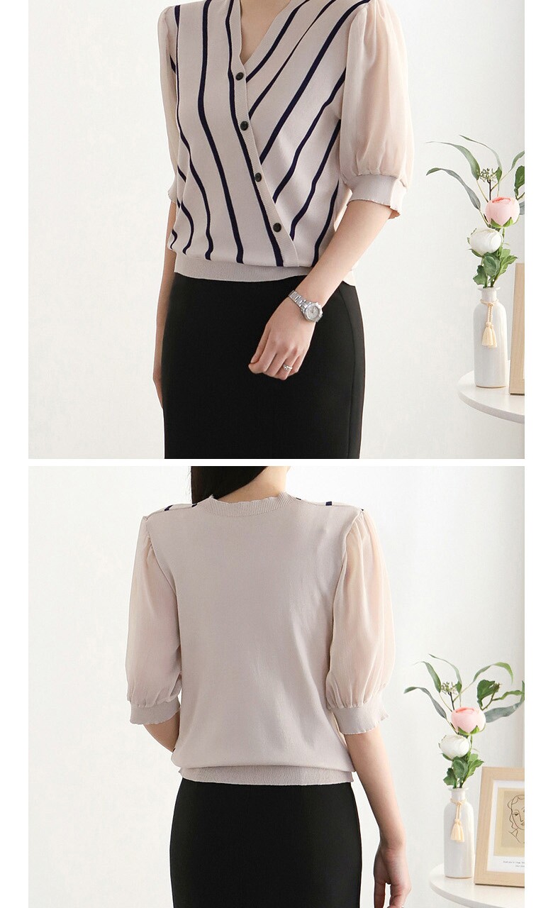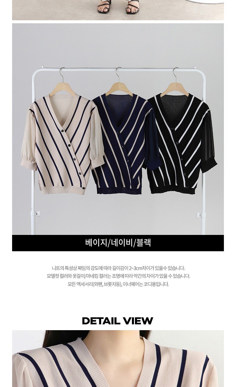 사선 줄무늬 단추 쉬폰소매 반팔 니트_PM2506KN610B