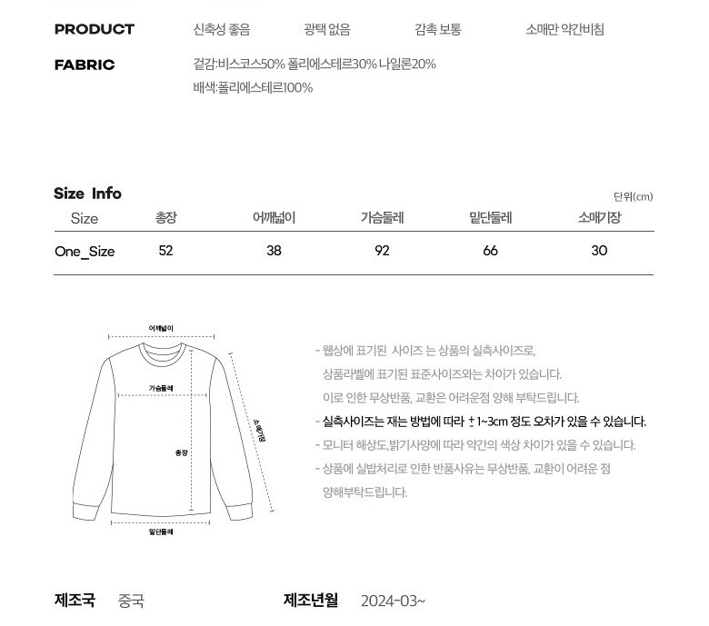 1. 제품 소재 (섬유의 조성 또는 혼용률을 백분율로 표시, 기능성인 경우 성적서 또는 허가서) | 겉감:비스코스50% 폴리에스테르30% 나일론20% 배색:폴리에스테르100% |