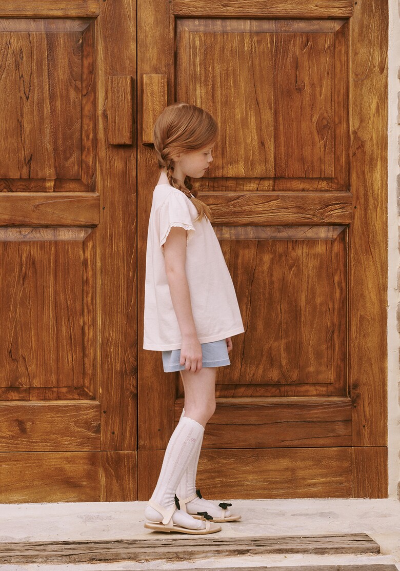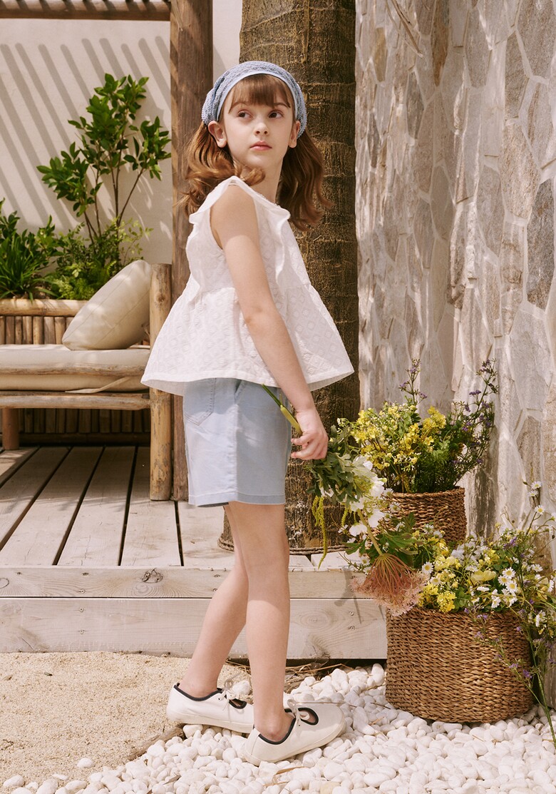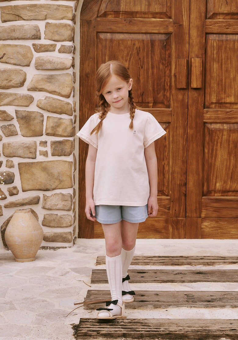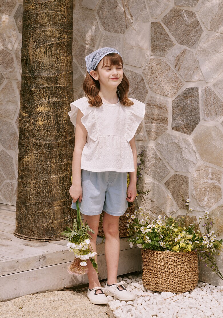 레이스 러플 블라우스 또는 핑크, 화이트 컬러의 티셔츠 등과 함께 사랑스럽고 활동적인 여아의 스타일링을 제안할 수 있습니다.