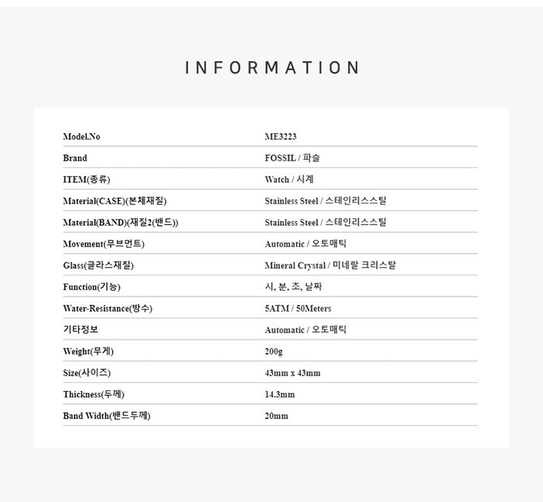 | 7. 주요 사양 | 스테인리스스틸 시계 오토매틱 |