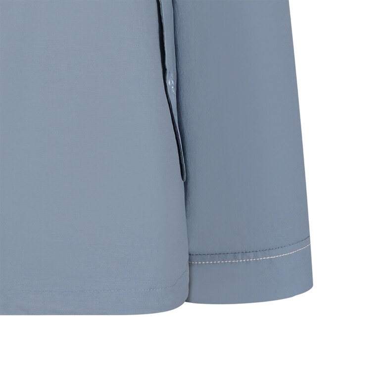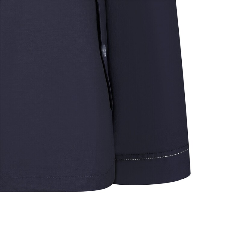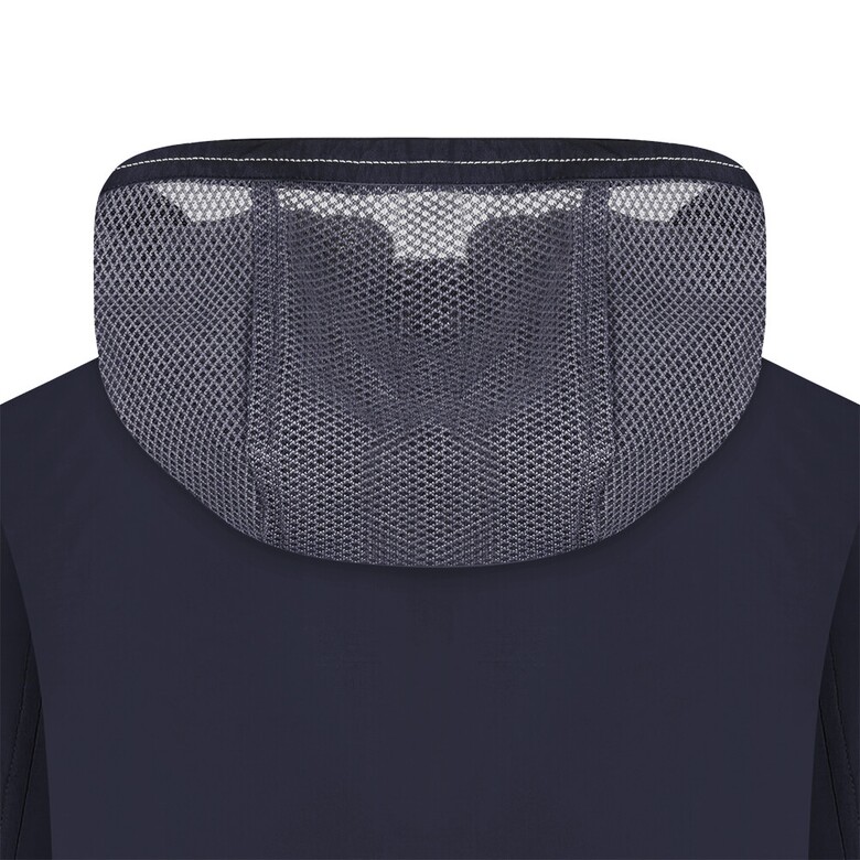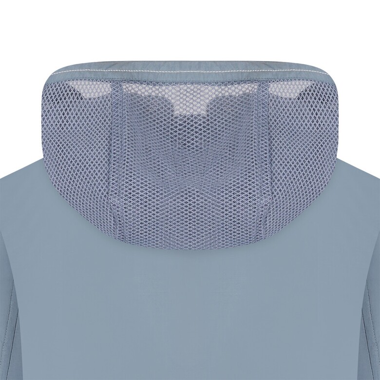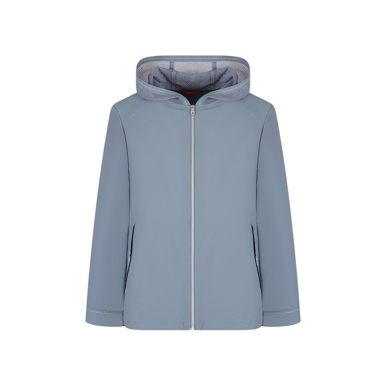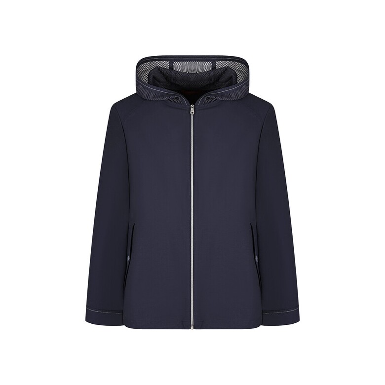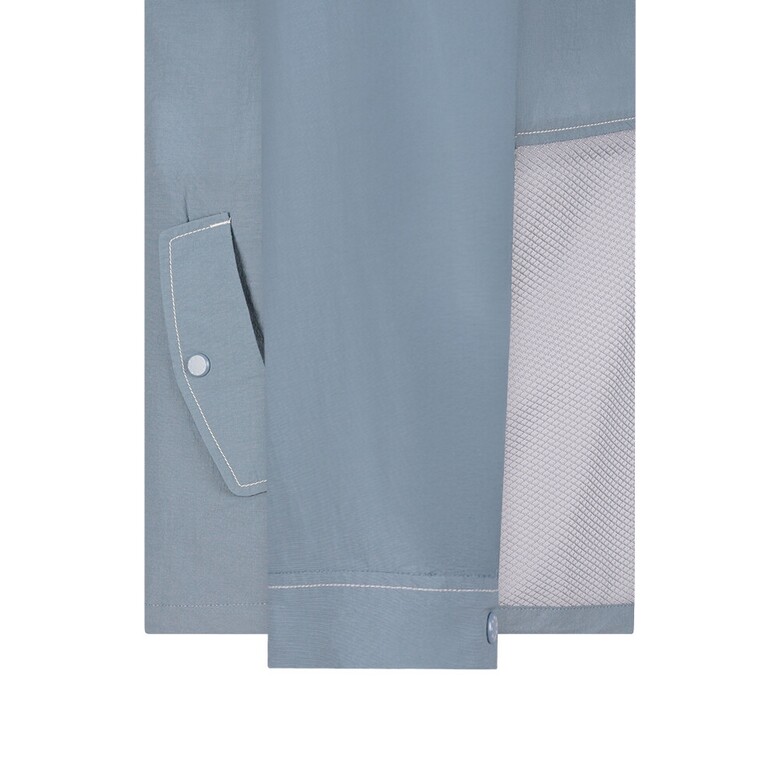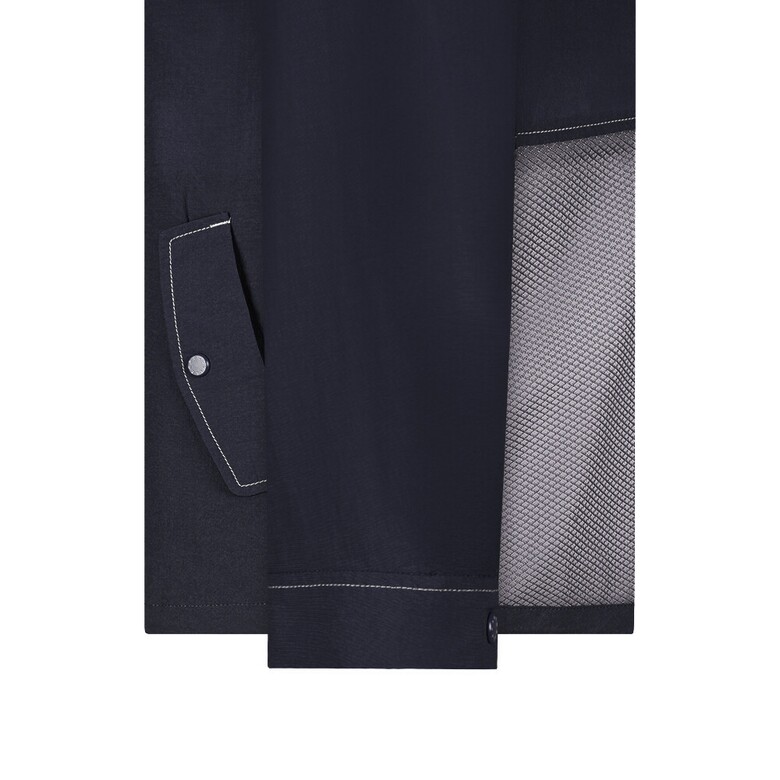 나일론 코튼 혼방 소재에 메쉬 배색을 넣어 착용시 가볍고 시원한 점퍼. 배색 스티치와 소매안쪽의 테이프 장식이 포인트.