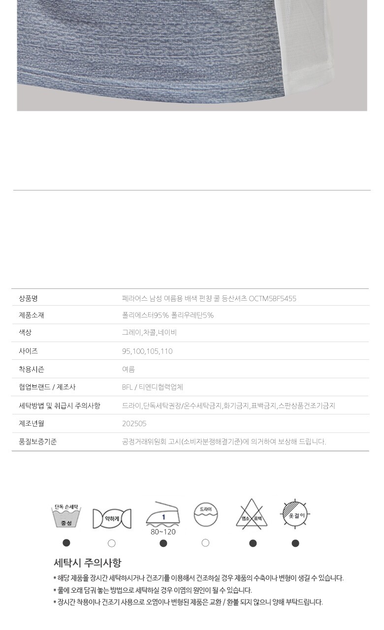 | 1. 제품 소재 (섬유의 조성 또는 혼용률을 백분율로 표시, 기능성인 경우 성적서 또는 허가서) | 상세설명참고 |