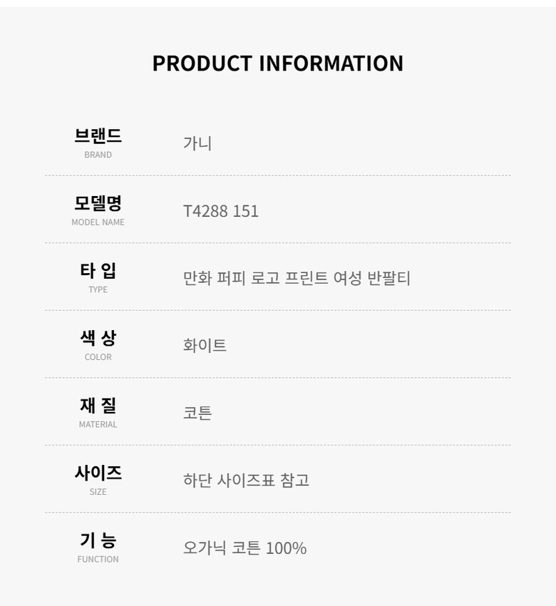 | 1. 제품 소재 (섬유의 조성 또는 혼용률을 백분율로 표시, 기능성인 경우 성적서 또는 허가서) | 코튼 |