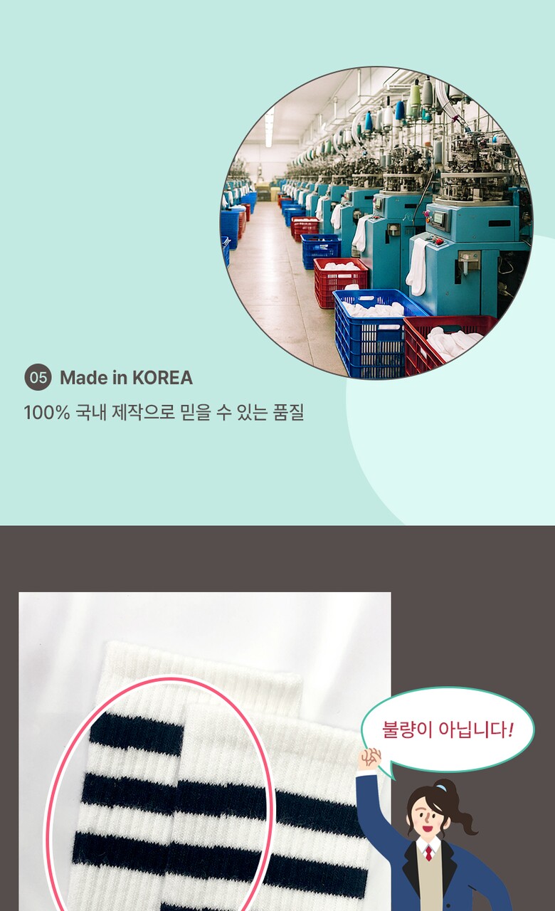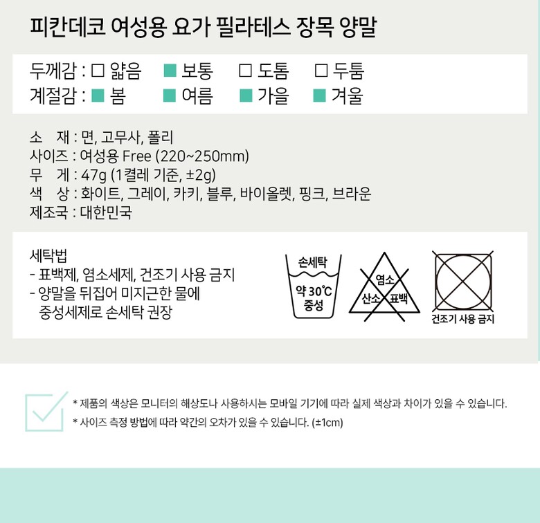 6. 취급시 주의사항 | -양말을 뒤집어 미지근한 물에 중성세제로 손세탁 권장 -표백제, 염소세제, 건조기 사용 금지 |