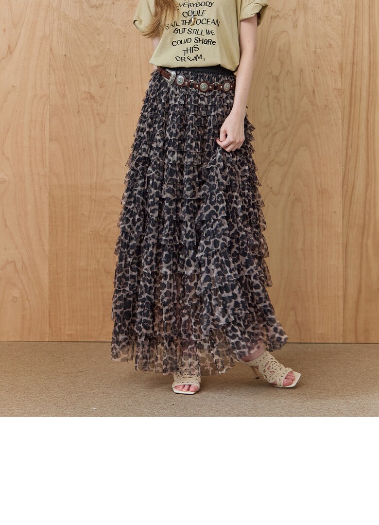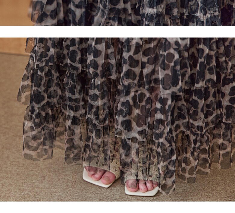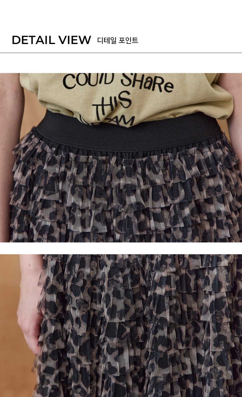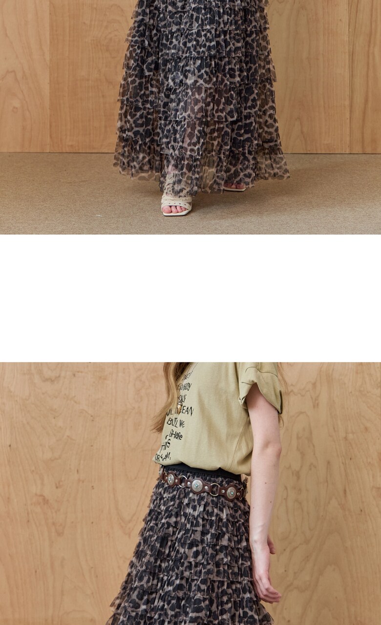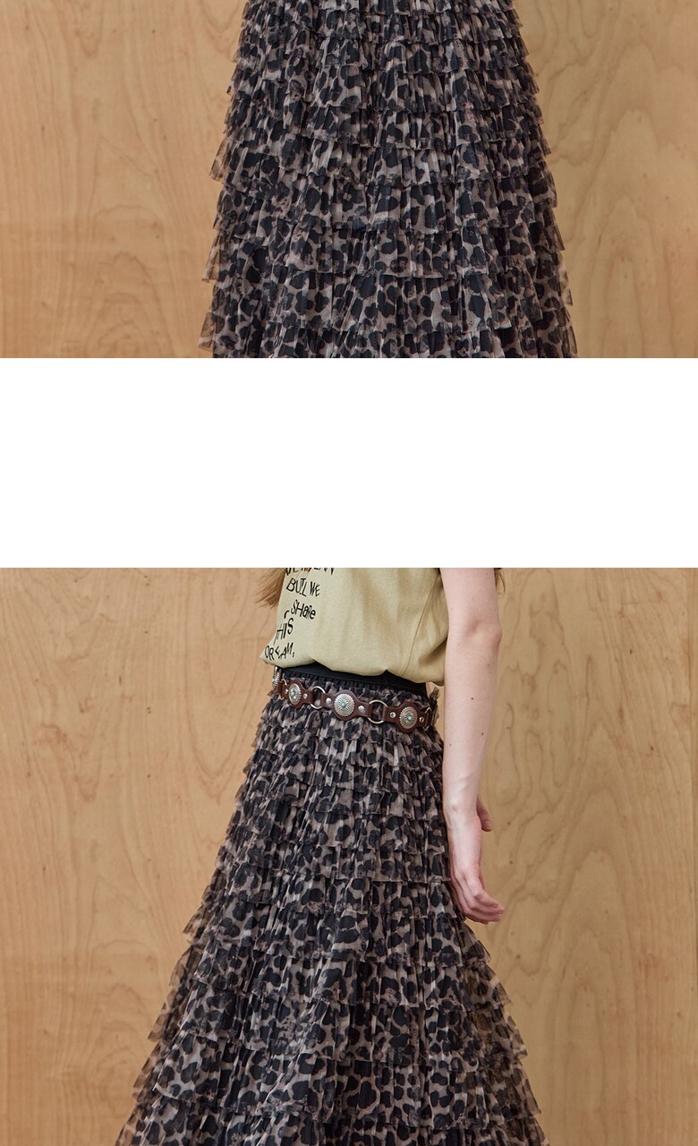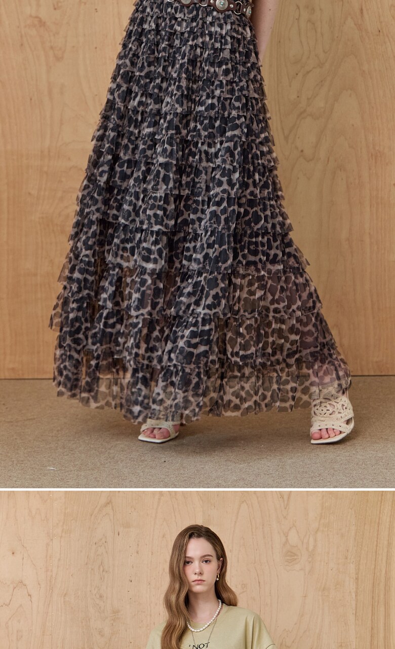레오파드 셔링 티어드 메쉬 롱 스커트
