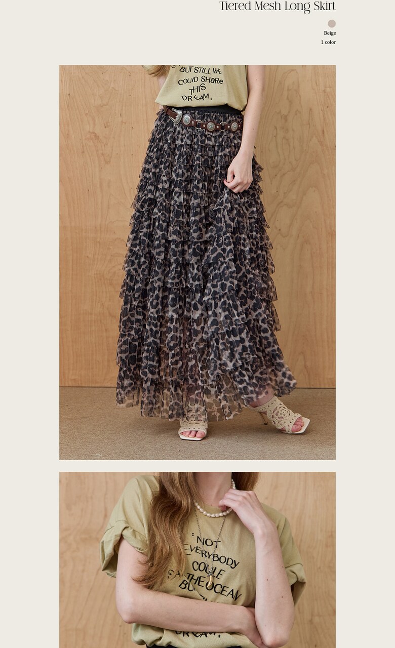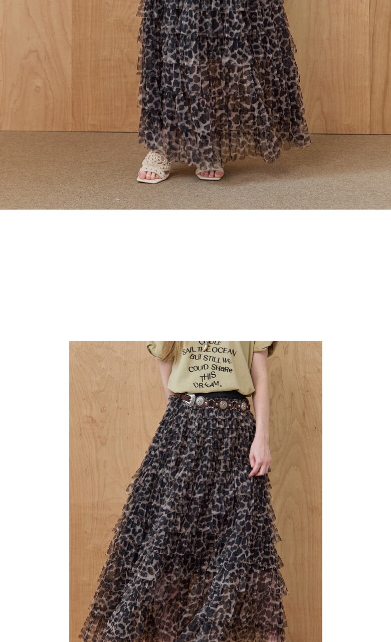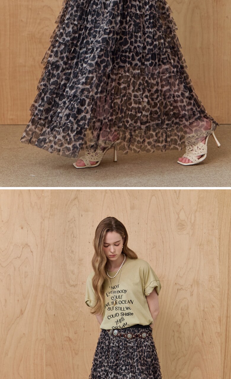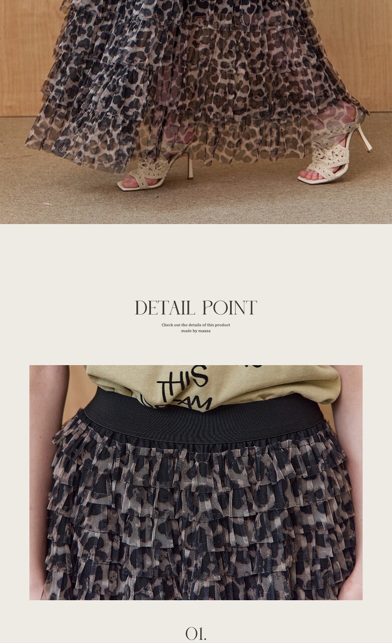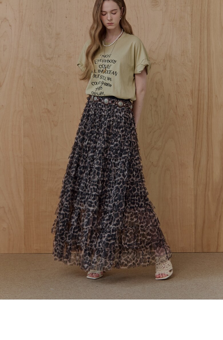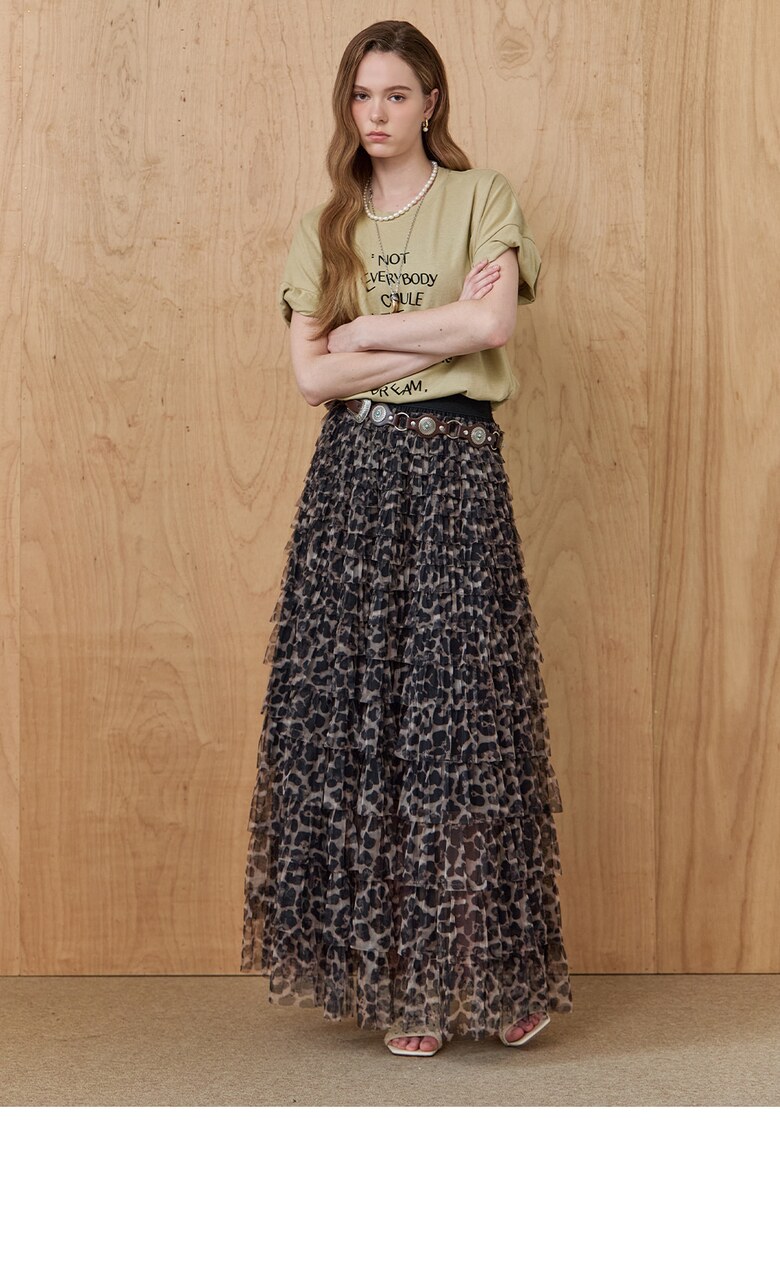레오파드 셔링 티어드 메쉬 롱 스커트