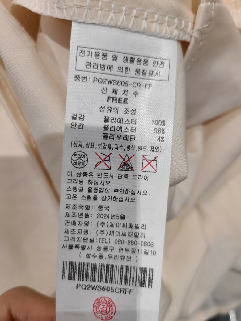 1. 제품 소재 (섬유의 조성 또는 혼용률을 백분율로 표시, 기능성인 경우 성적서 또는 허가서) 안감:폴리에스테르 96%, 폴리우레탄 4%