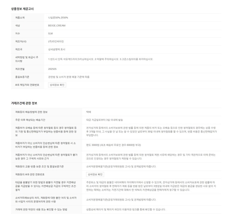 1. 제품 소재 (섬유의 조성 또는 혼용률을 백분율로 표시, 기능성인 경우 성적서 또는 허가서) | 상품상세참조 |