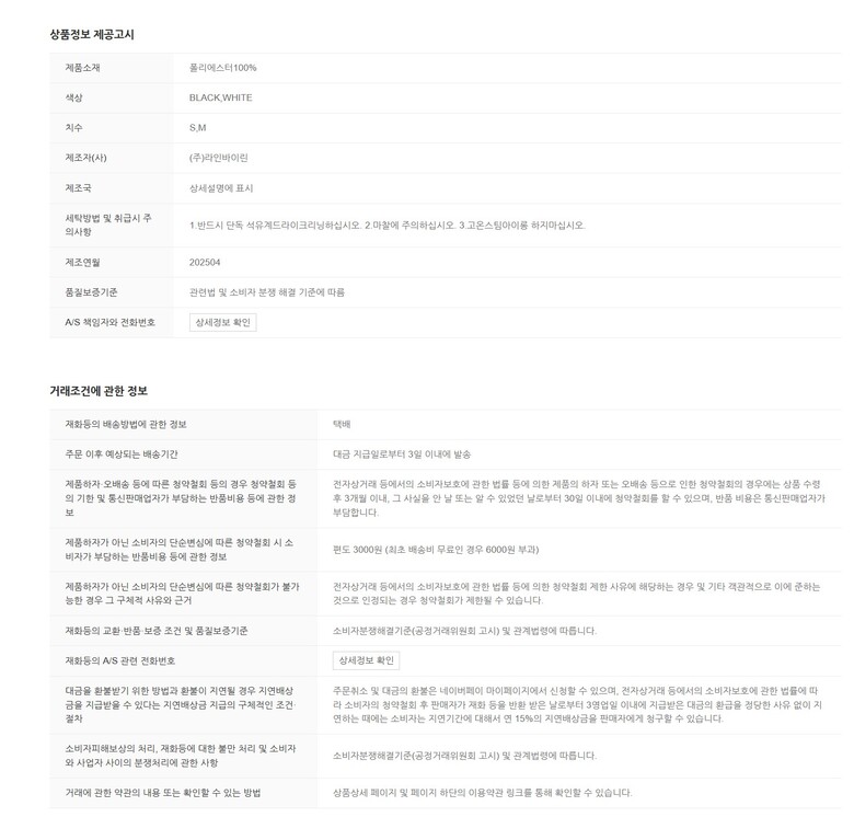 6. 세탁방법 및 취급시 주의사항 | 상품상세참조 |